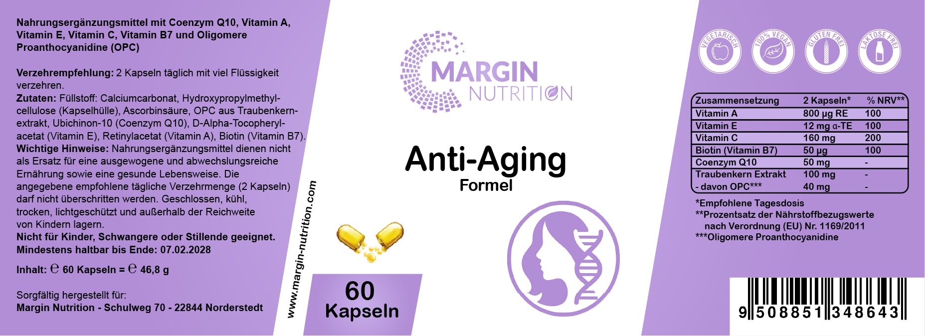Anti-Aging Formel – Mit Coenzym Q10, Vitamin A, Vitamin E, Vitamin C, Vitamin B7 (Biotin) und Traubenkernextrakt (OPC) | 30, 60, 2×60, 3×60 vegane Kapseln