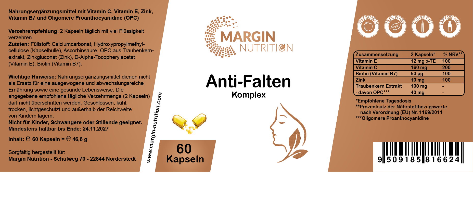 Anti-Falten Komplex / Mit Vitamin C, Vitamin E, Zink, Vitamin B7 (Biotin) und Oligomere Proanthocyanidine (OPC) (30, 60, 2x60, 3x60 Vegane Kapseln)