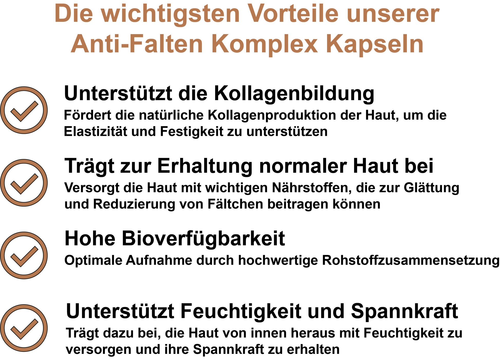 Unsere Kapseln enthalten hochwertige, gut bioverfügbare Inhaltsstoffe, die vom Körper aufgenommen und verwertet werden können. Sie tragen zur normalen Kollagenbildung bei, schützen die Zellen vor oxidativem Stress und unterstützen die Hautfunktion.