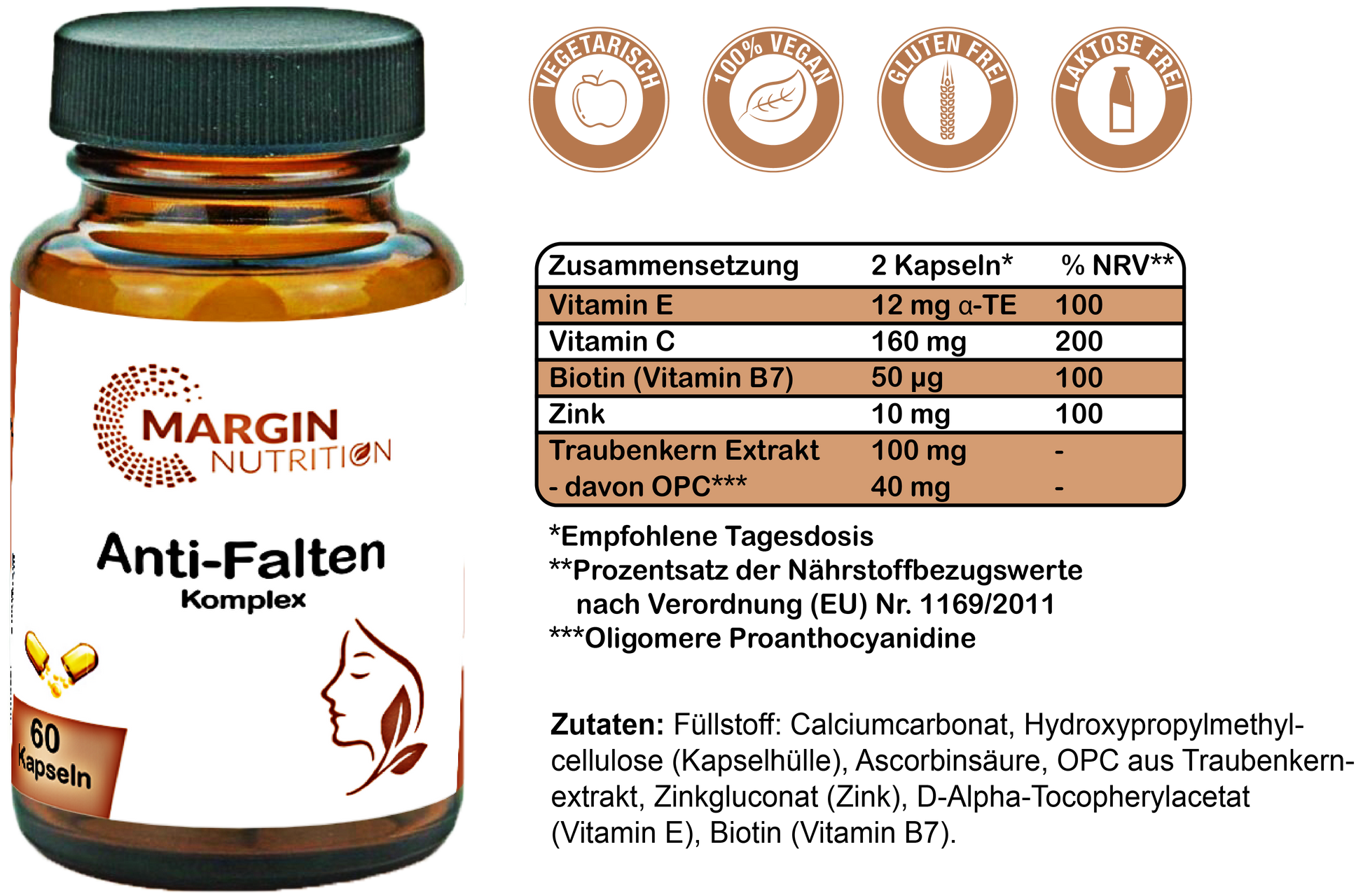 Füllstoff: Calciumcarbonat, Hydroxypropylmethylcellulose (Kapselhülle), Ascorbinsäure, OPC aus Traubenkernextrakt, Zinkgluconat (Zink), D-Alpha-Tocopherylacetat (Vitamin E), Biotin (Vitamin B7).Verzehrempfehlung: