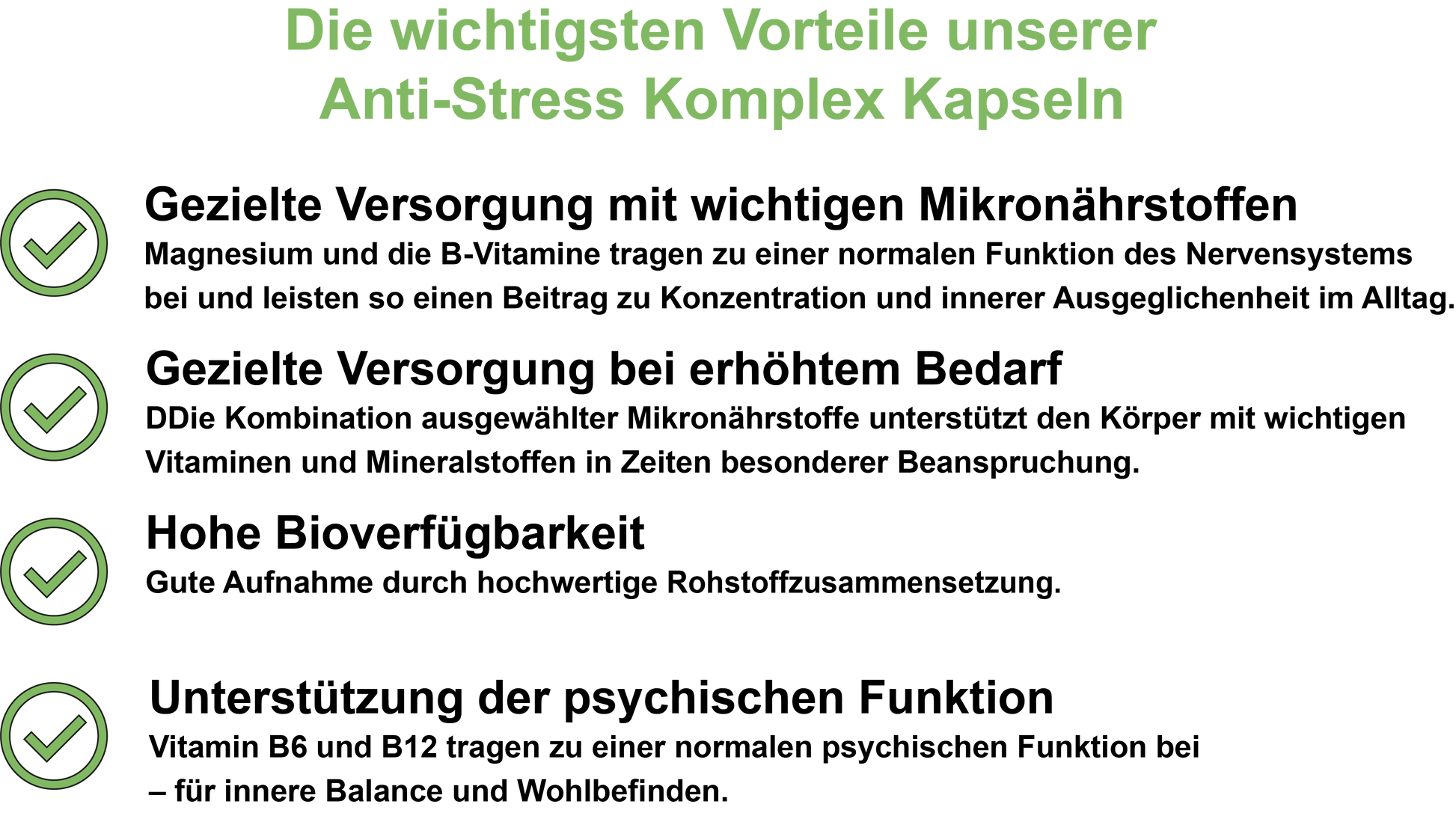 Unsere Anti-Stress Komplex Kapseln sind eine sinnvolle Ergänzung zur Unterstützung von Energie, Konzentration und einem normalen Nervensystem. Die enthaltenen Mikronährstoffe tragen zu einer normalen psychischen Funktion bei und leisten einen Beitrag zur Verringerung von Müdigkeit und Ermüdung – besonders in herausfordernden Lebensphasen.
