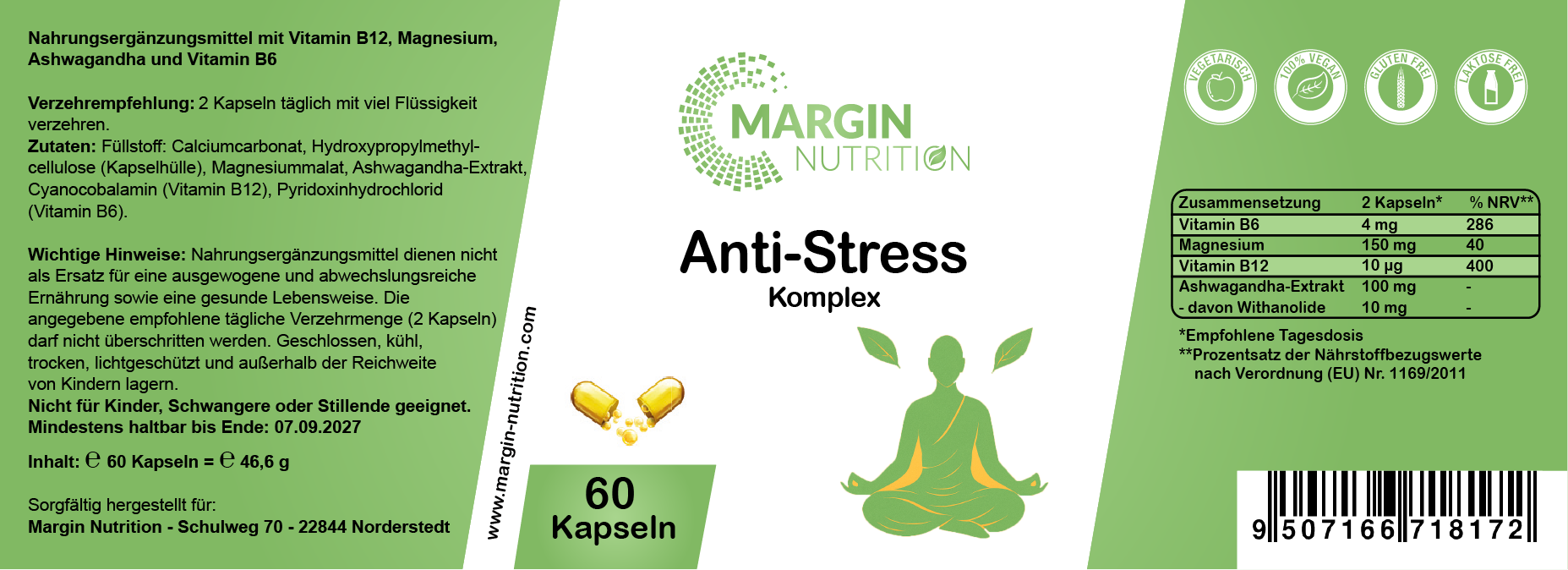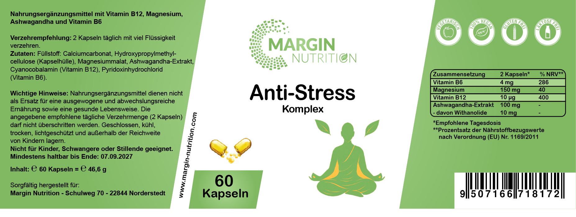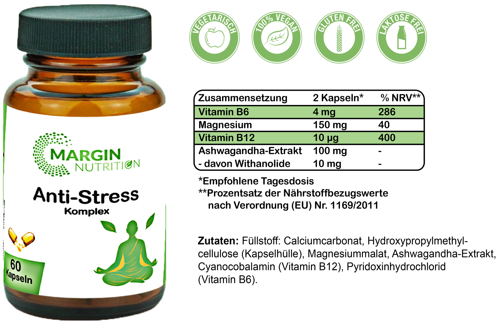 Füllstoff: Calciumcarbonat, Hydroxypropylmethylcellulose (Kapselhülle), Magnesiummalat, Ashwagandha-Extrakt, Cyanocobalamin (Vitamin B12), Pyridoxinhydrochlorid (Vitamin B6).Verzehrempfehlung: