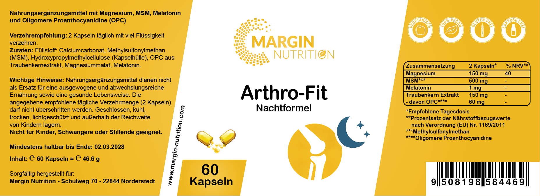 Arthro-Fit Nachtformel – Mit Magnesium, MSM, Melatonin und Oligomere Proanthocyanidine (OPC) | 30, 60, 2×60, 3×60 vegane Kapseln