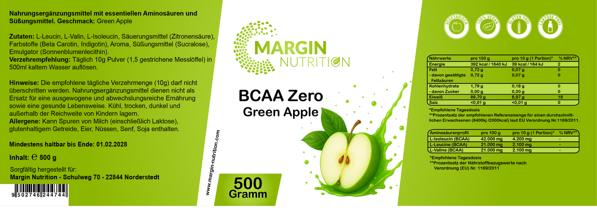 Nahrungsergänzungsmittel mit essentiellen Aminosäuren und Süßungsmittel. Geschmack: Green Apple