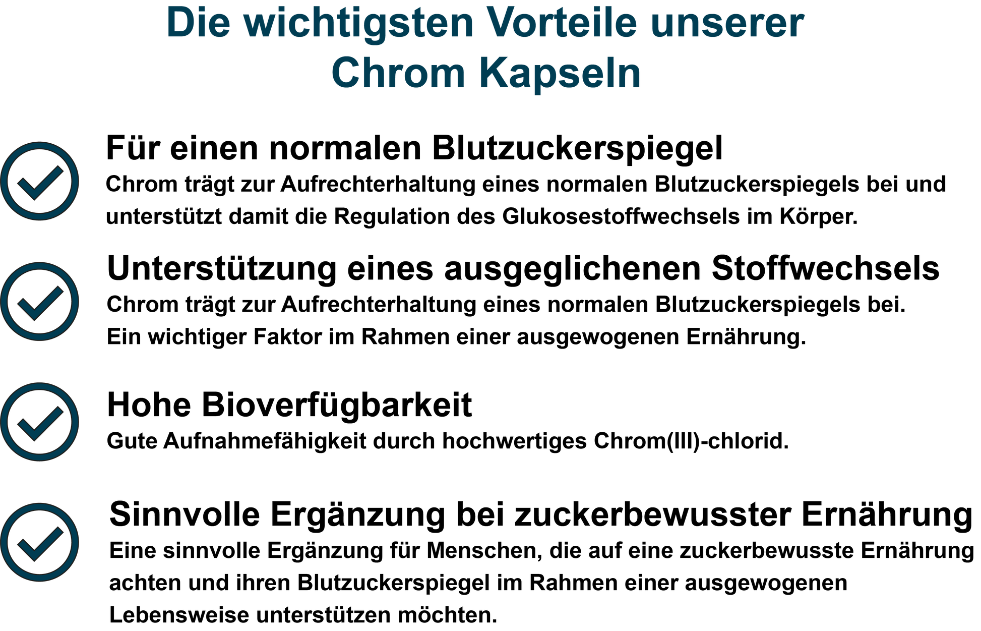 Unsere Chrom Kapseln enthalten das essenzielle Spurenelement Chrom, das zur Aufrechterhaltung normaler Stoffwechselfunktionen beiträgt und eine Rolle bei der Regulation des Blutzuckerspiegels spielt. Chrom trägt zu einem normalen Kohlenhydrat-, Fett- und Eiweißstoffwechsel sowie zur Aufrechterhaltung eines normalen Blutzuckerspiegels bei.