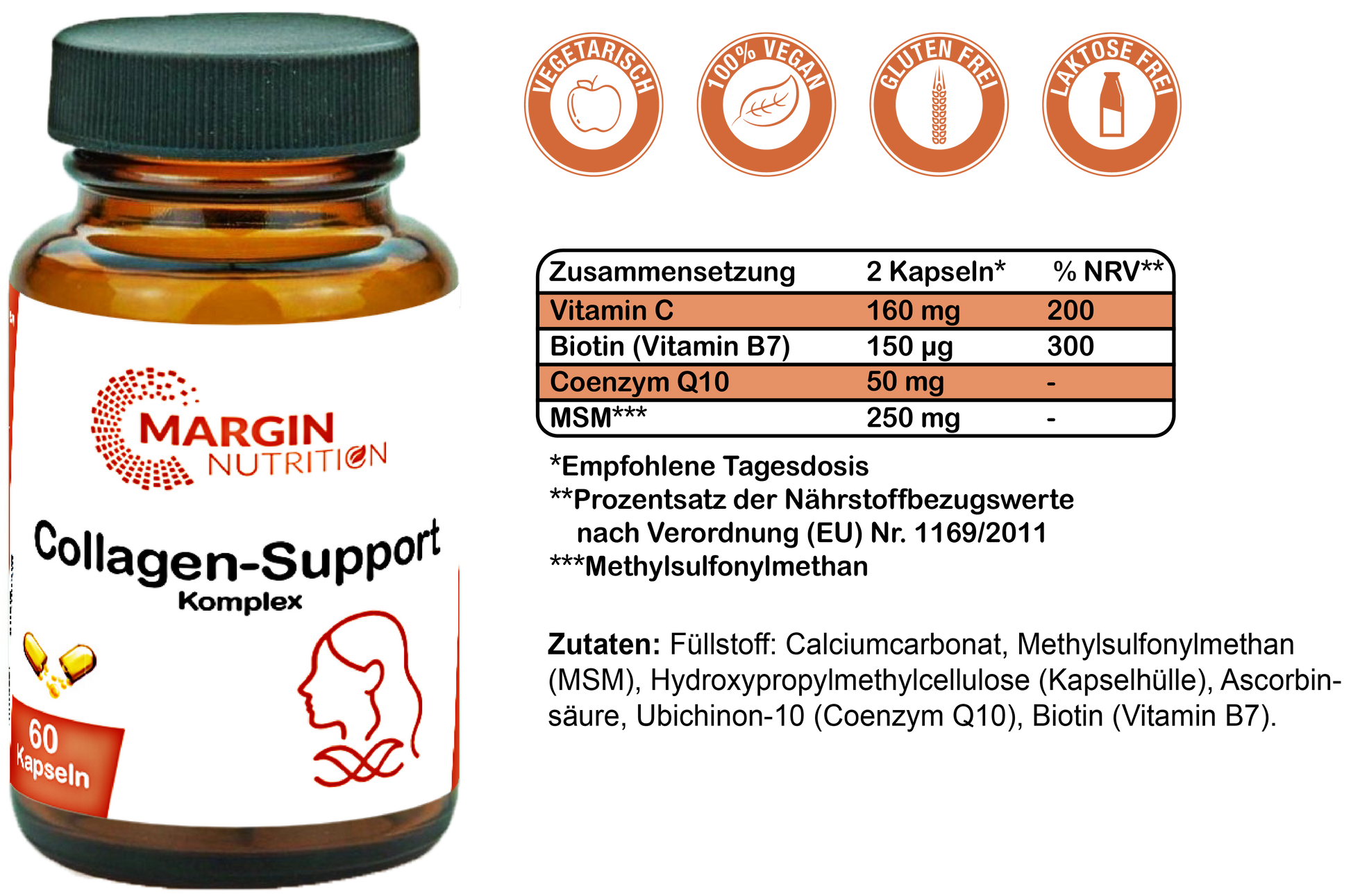 Füllstoff: Calciumcarbonat, Methylsulfonylmethan (MSM), Hydroxypropylmethylcellulose (Kapselhülle), Ascorbinsäure, Ubichinon-10 (Coenzym Q10), Biotin (Vitamin B7).Verzehrempfehlung: