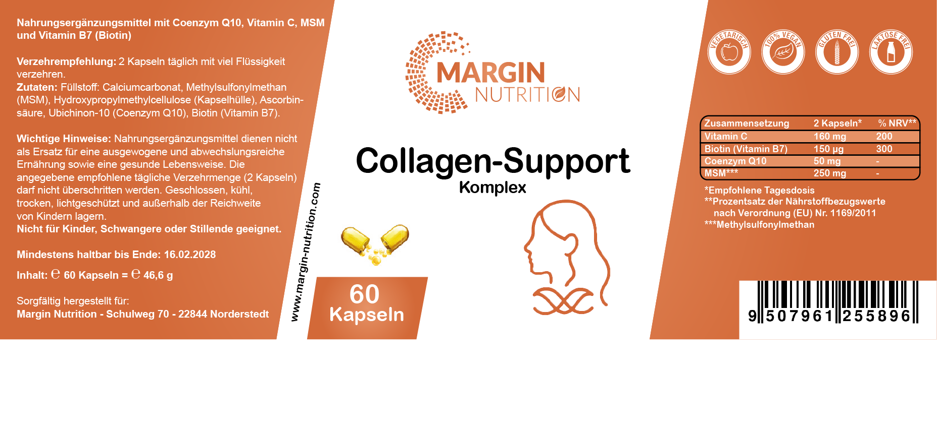 Collagen-Support Komplex / Mit Coenzym Q10, Vitamin C, MSM und Vitamin B7 (Biotin) (30, 60, 2x60, 3x60 Vegane Kapseln)
