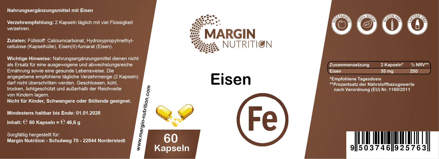 Füllstoff: Calciumcarbonat, Hydroxypropylmethylcellulose (Kapselhülle), Eisen(II)-fumarat (Eisen).Verzehrempfehlung: