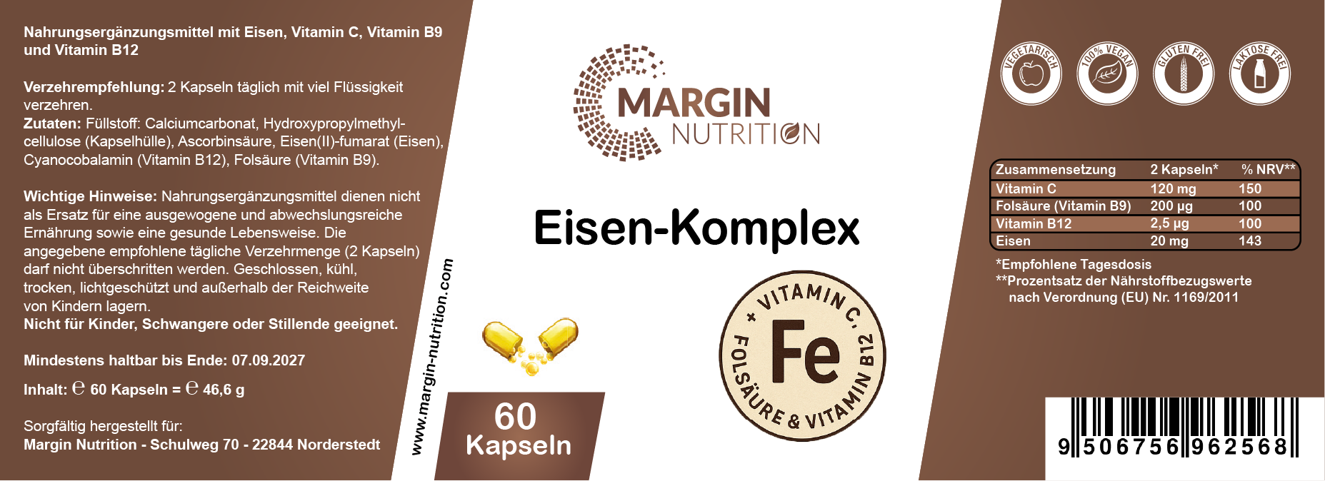 Eisen-Komplex – Mit Eisen, Vitamin C, Vitamin B9 (Folsäure), Vitamin B12 | 30, 60, 2×60, 3×60 vegane Kapseln