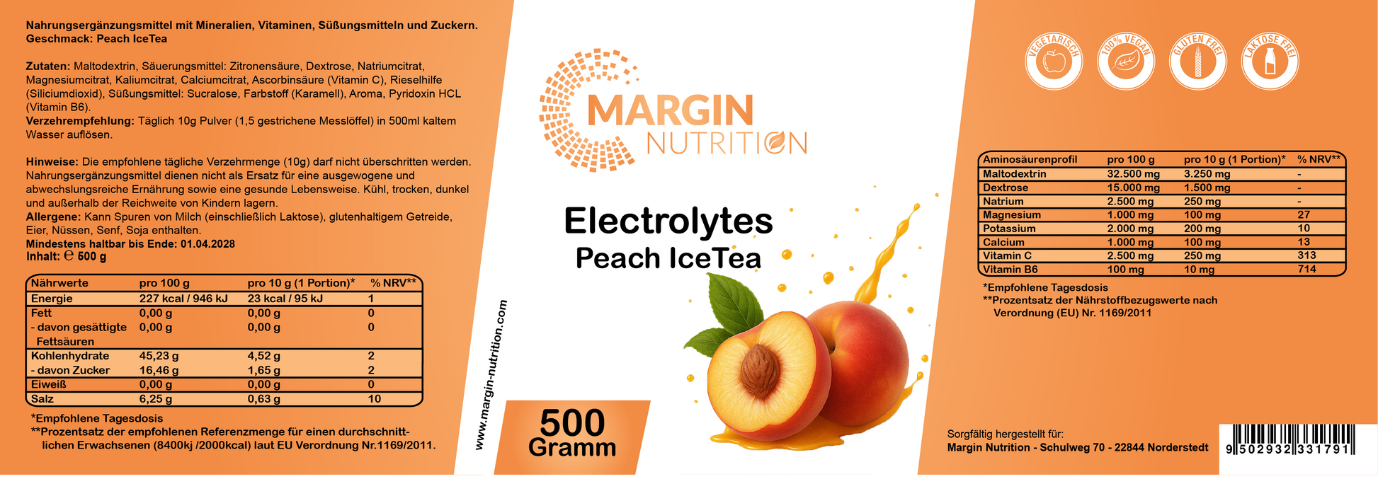 Nahrungsergänzungsmittel mit Mineralien, Vitaminen, Süßungsmitteln und Zuckern. Geschmack: Peach IceTea