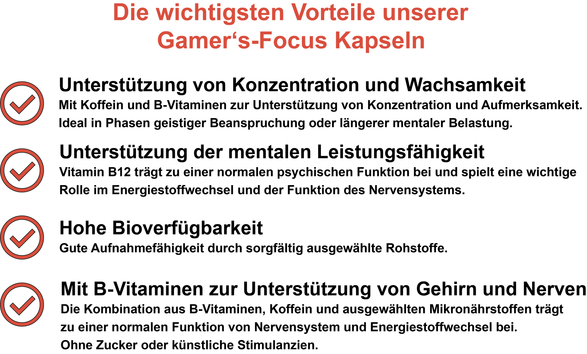 Unsere Gamer’s-Focus Kapseln wurden gezielt entwickelt, um mentale Leistungsfähigkeit, Konzentration und Energie in anspruchsvollen Spiel- oder Arbeitsphasen zu unterstützen. Ob bei langen Gaming-Sessions, kreativer Projektarbeit oder intensiven Lernphasen, die enthaltenen Mikronährstoffe helfen dabei, fokussiert, wach und leistungsbereit zu bleiben.