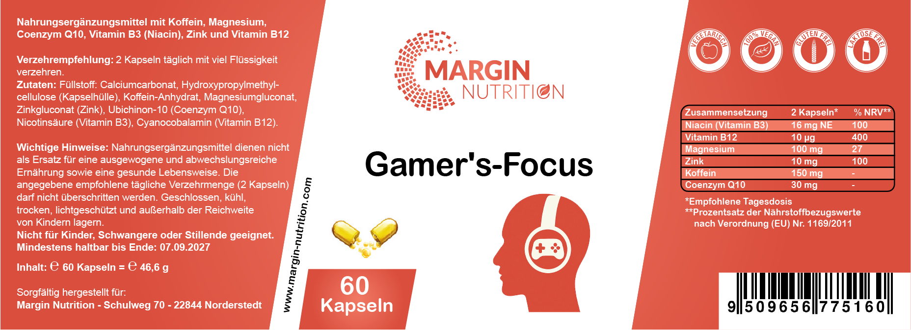 Bei der Entwicklung unserer Gamer’s-Focus Kapseln mit 150 mg Koffein, 100 mg Magnesium, 16 mg Niacin, 10 µg Vitamin B12, 10 mg Zink und 30 mg Coenzym Q10 pro Tagesdosis haben wir bewusst auf eine leistungsorientierte Formulierung gesetzt, die den besonderen Anforderungen mental anspruchsvoller Phasen gerecht wird. Die Dosierung basiert auf aktuellen ernährungswissenschaftlichen Erkenntnissen und unterstützt den Energiestoffwechsel und die normale Funktion von Nervensystem und Psyche.