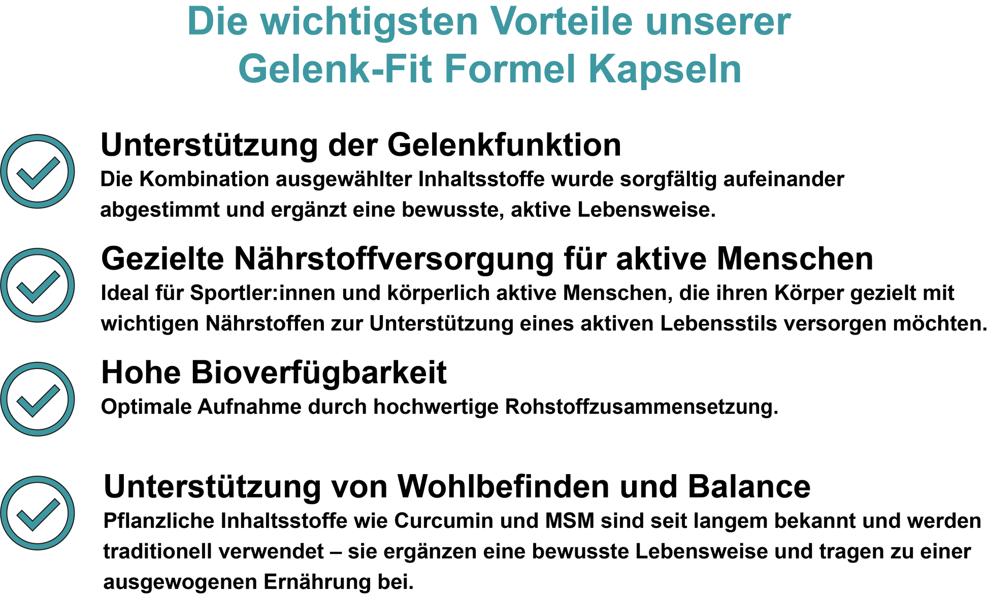 Die Gelenk-Fit Formel trägt mit ihren Inhaltsstoffen unter anderem bei zu: