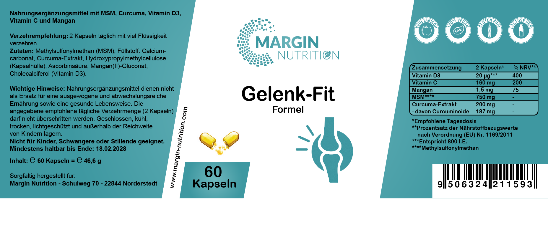 Gelenk-Fit Formel / Mit MSM, Curcuma, Vitamin D3, Vitamin C und Mangan (30, 60, 2x60, 3x60 Vegane Kapseln)