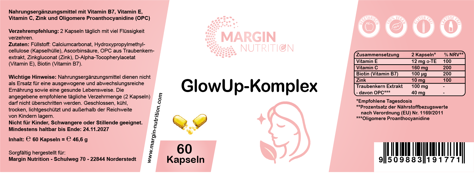 GlowUp-Komplex / Mit Vitamin B7 (Biotin), Vitamin C, Vitamin E, Zink und Oligomere Proanthocyanidine (OPC) (30, 60, 2x60, 3x60 Vegane Kapseln)