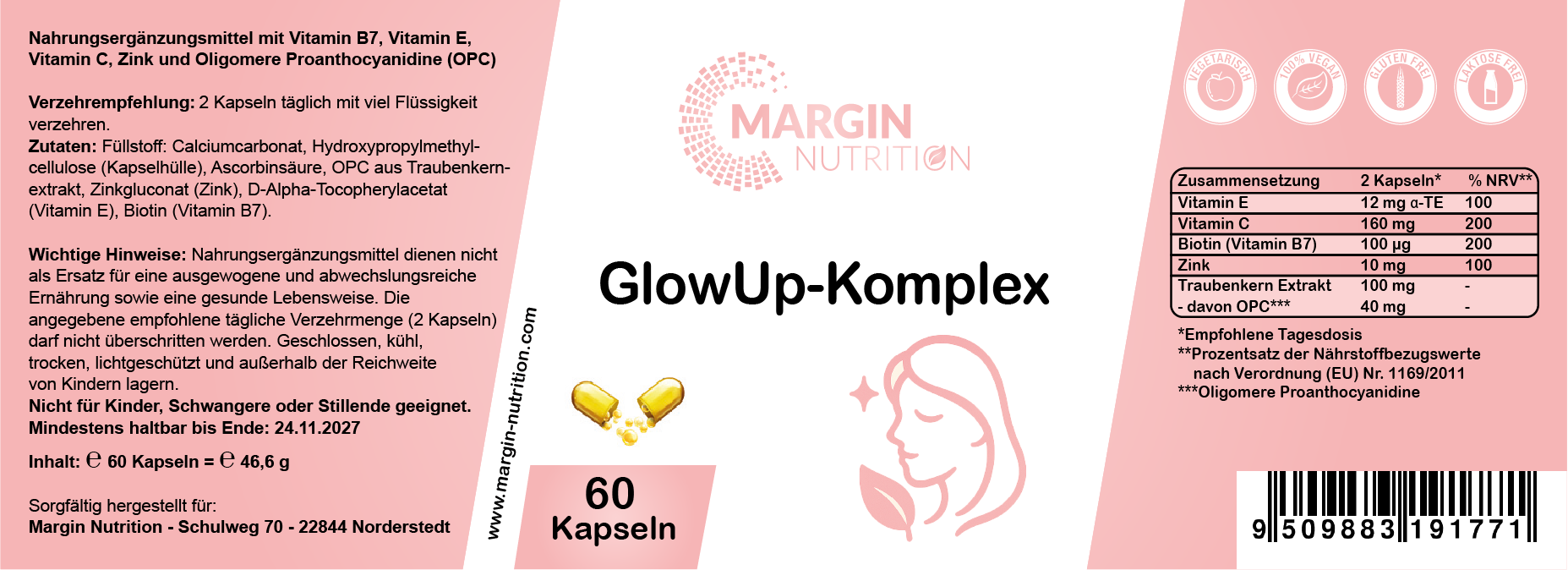 Füllstoff: Calciumcarbonat, Hydroxypropylmethylcellulose (Kapselhülle), Ascorbinsäure, OPC aus Traubenkernextrakt, Zinkgluconat (Zink), D-Alpha-Tocopherylacetat (Vitamin E), Biotin (Vitamin B7)Verzehrempfehlung: