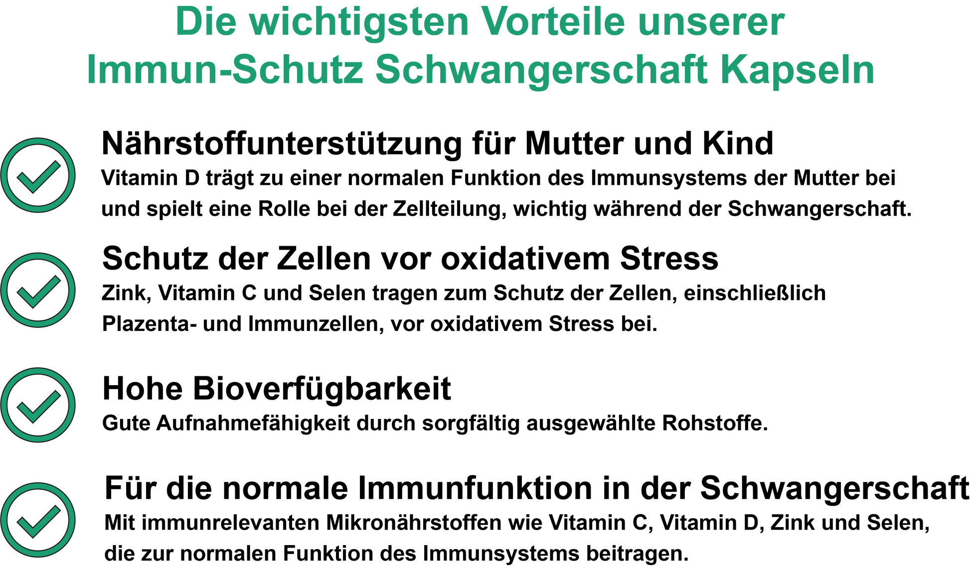 In der Schwangerschaft verändert sich das Immunsystem, um das ungeborene Kind zu schützen – gleichzeitig kann die Anfälligkeit für Infekte erhöht sein. Eine gezielte Versorgung mit immunrelevanten Mikronährstoffen wie Vitamin C, D3, Zink, Selen und B12 trägt zur normalen Funktion des Immunsystems bei und unterstützt den Zellschutz.