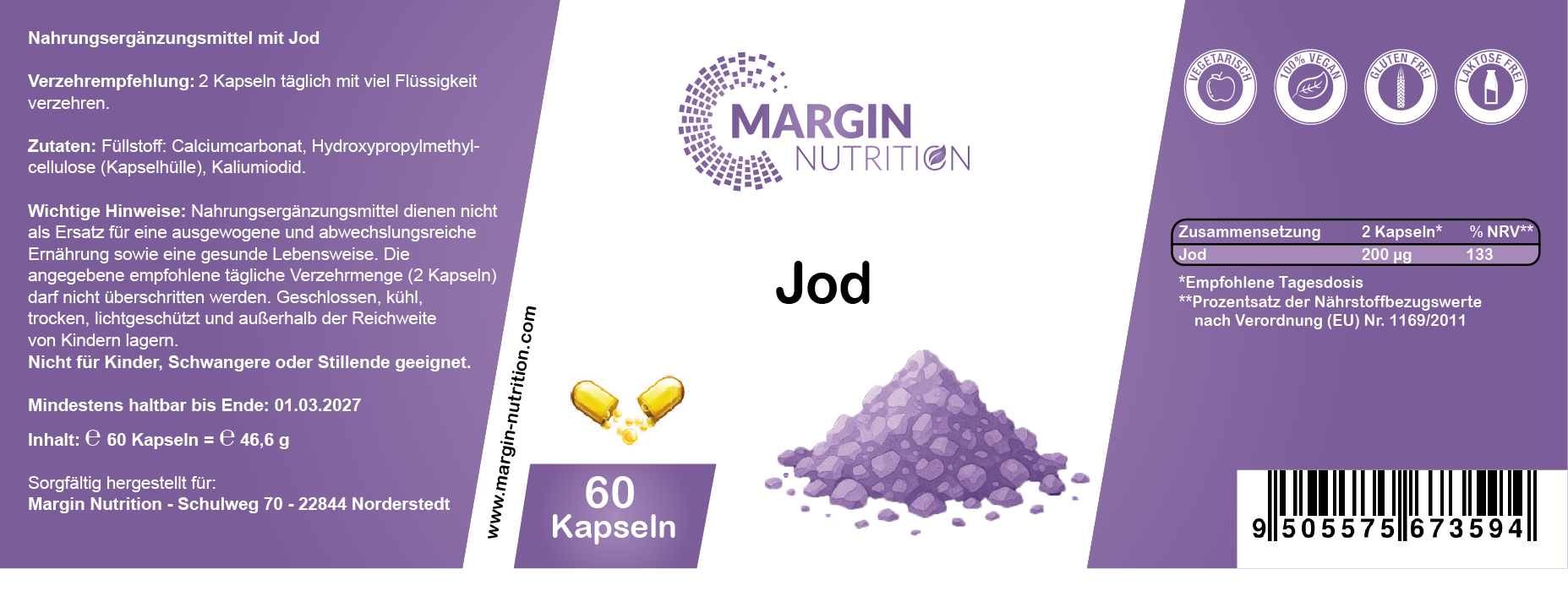 Jod ist ein essentielles Spurenelement, das zur normalen Produktion von Schilddrüsenhormonen und zur normalen Funktion der Schilddrüse beiträgt. Außerdem unterstützt es den normalen Energiestoffwechsel, die normale Funktion des Nervensystems sowie die Erhaltung normaler kognitiver Funktionen.