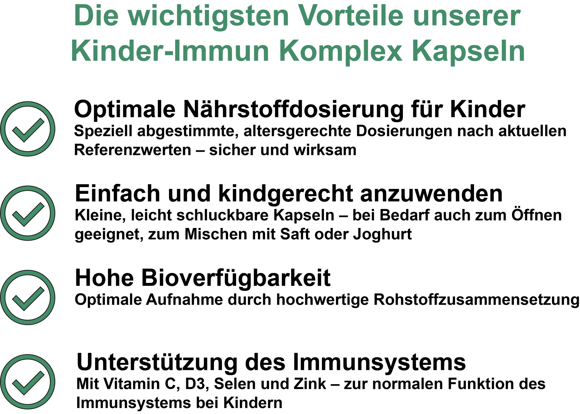 Unsere Kapseln enthalten ausschließlich gut bioverfügbare, kindgerecht dosierte Inhaltsstoffe, die vom Körper effizient aufgenommen und verwertet werden können. Sie tragen zur normalen Funktion des Immunsystems bei, unterstützen den Schutz der Zellen vor oxidativem Stress und leisten einen Beitrag zur gesunden Entwicklung in Wachstums- und Lernphasen.