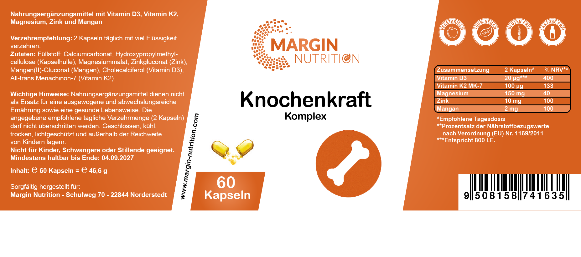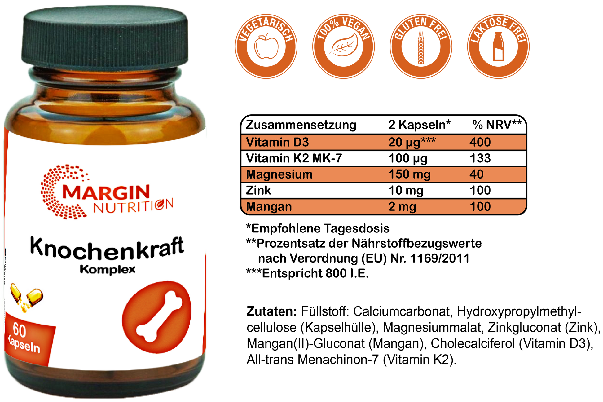 Füllstoff: Calciumcarbonat, Hydroxypropylmethylcellulose (Kapselhülle), Magnesiummalat, Zinkgluconat (Zink), Mangan(II)-Gluconat (Mangan), Cholecalciferol (Vitamin D3), All-trans Menachinon-7 (Vitamin K2).Verzehrempfehlung: