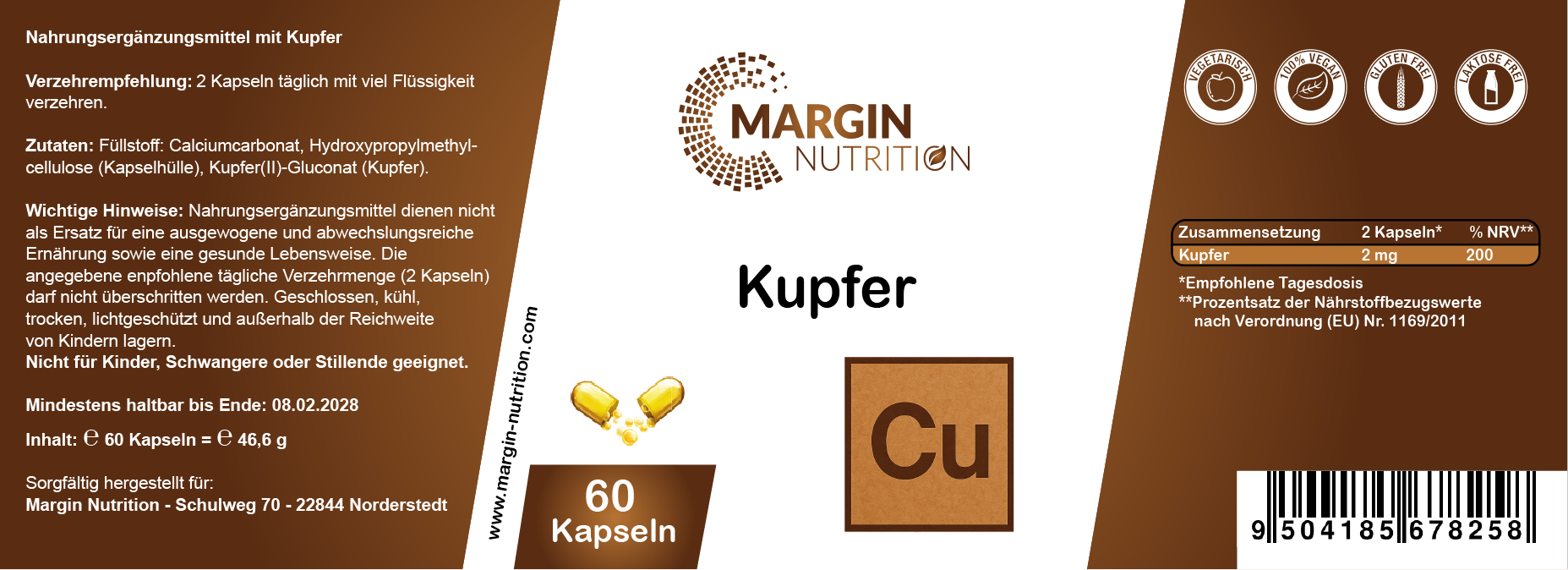 Füllstoff: Calciumcarbonat, Hydroxypropylmethylcellulose (Kapselhülle), Kupfer(II)-Gluconat (Kupfer).Verzehrempfehlung: