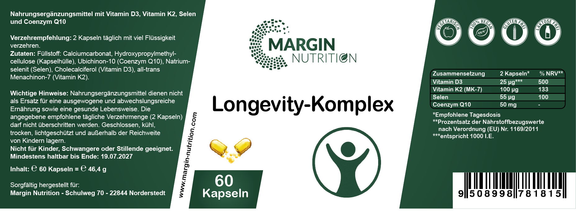 Unser Longevity-Komplex vereint vier essenzielle Mikronährstoffe, die gezielt aufeinander abgestimmt sind: Vitamin D3, Vitamin K2, Selen und Coenzym Q10. Die Kombination wurde speziell entwickelt, um zentrale Funktionen wie Zellschutz, Knochengesundheit, Immunfunktion und Energieproduktion zu unterstützen – besonders im Erwachsenenalter und in Phasen erhöhter Anforderungen. Die Dosierung basiert auf aktuellen ernährungswissenschaftlichen Erkenntnissen und wurde so gewählt, dass sie zur täglichen Basisversorgung eine sinnvolle Ergänzung darstellt.