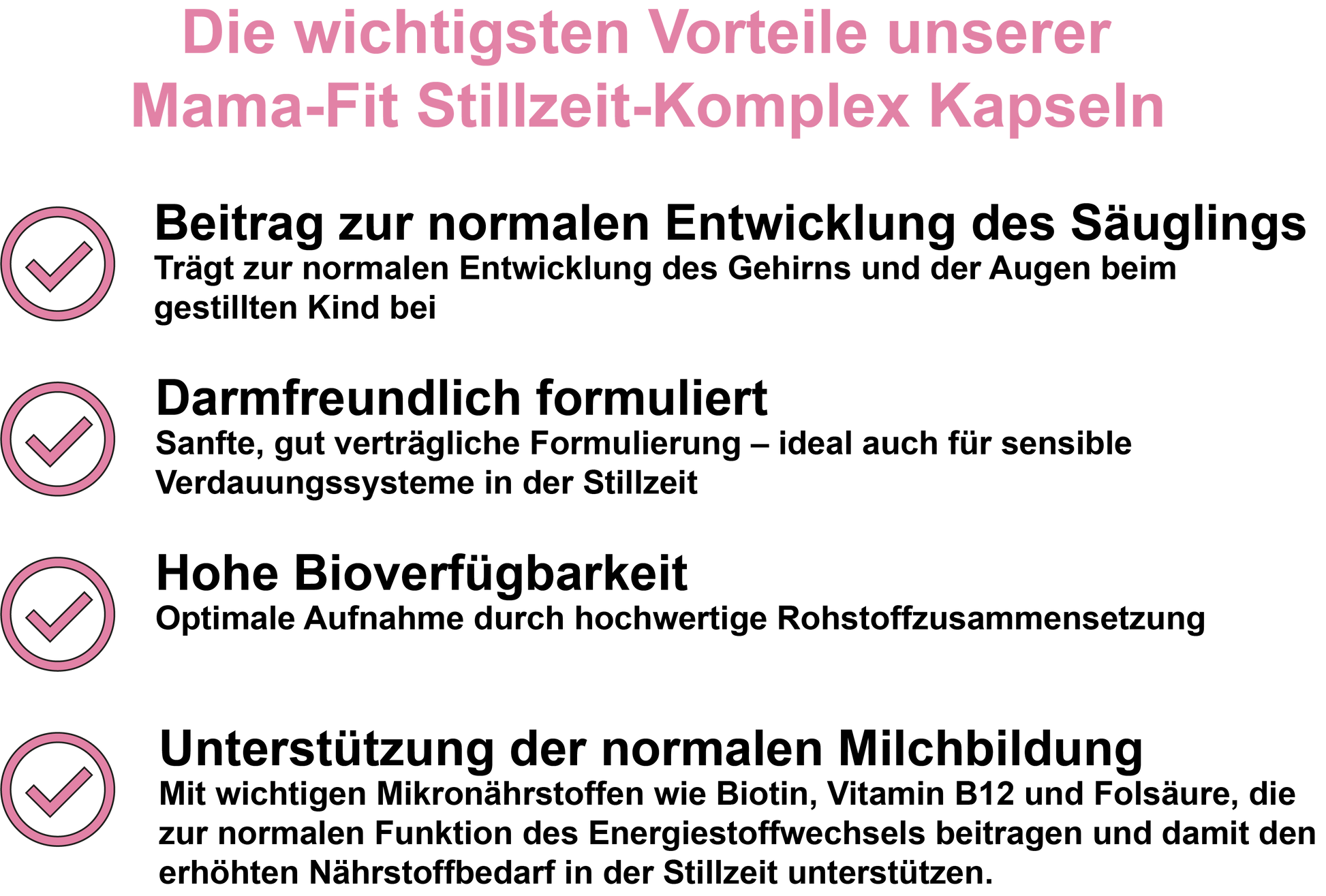 Unsere Kapseln enthalten hochwertige, gut bioverfügbare Inhaltsstoffe, die vom Körper effizient aufgenommen und verwertet werden können. Sie unterstützen das Immunsystem, den Energiestoffwechsel und die geistige Leistungsfähigkeit und tragen zur Verringerung von Müdigkeit bei – für eine starke Mutter und einen guten Start in die Stillzeit.