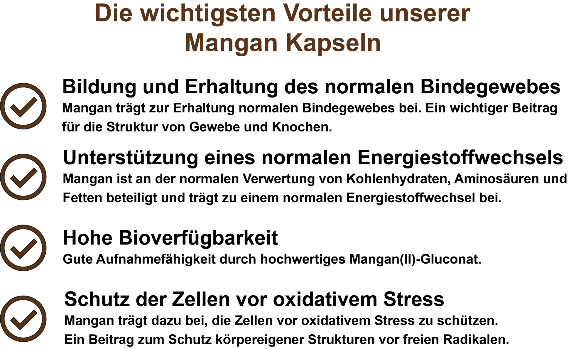 Das essenzielle Spurenelement Mangan trägt zu einem normalen Energiestoffwechsel, zur normalen Bildung von Bindegewebe sowie zum Schutz der Zellen vor oxidativem Stress bei.