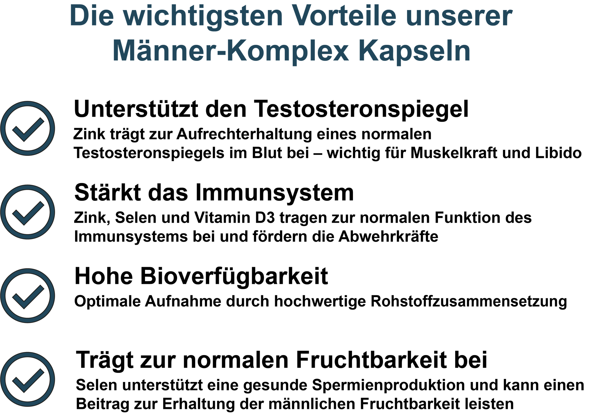 Unser Männer-Komplex vereint fünf gezielt ausgewählte Mikronährstoffe: Zink, Selen, Vitamin D3, Vitamin B12 und Coenzym Q10. Diese sorgfältig abgestimmte Kombination wurde entwickelt, um wichtige Funktionen des männlichen Körpers zu unterstützen – darunter die normale Funktion des Immunsystems, den Zellschutz, den Energiestoffwechsel und die Aufrechterhaltung eines normalen Testosteronspiegels im Blut. Ideal für Männer mit aktivem Lebensstil oder als tägliche Ergänzung bei unausgewogener Ernährung. Die Dosierung basiert auf aktuellen ernährungswissenschaftlichen Erkenntnissen und wurde so gewählt, dass sie eine sinnvolle Unterstützung der täglichen Nährstoffversorgung bietet.