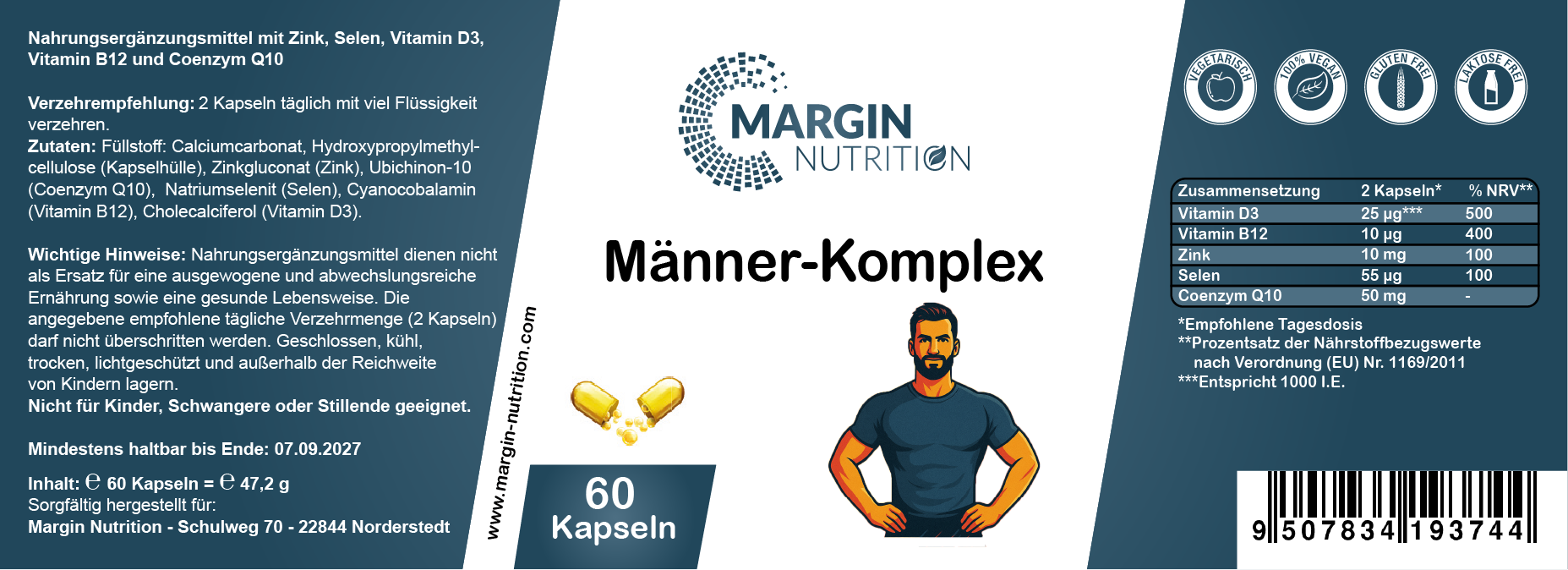Männer-Komplex – Mit Zink, Selen, Vitamin D3, Vitamin B12 und Coenzym Q10 | 30, 60, 2×60, 3×60 vegane Kapseln