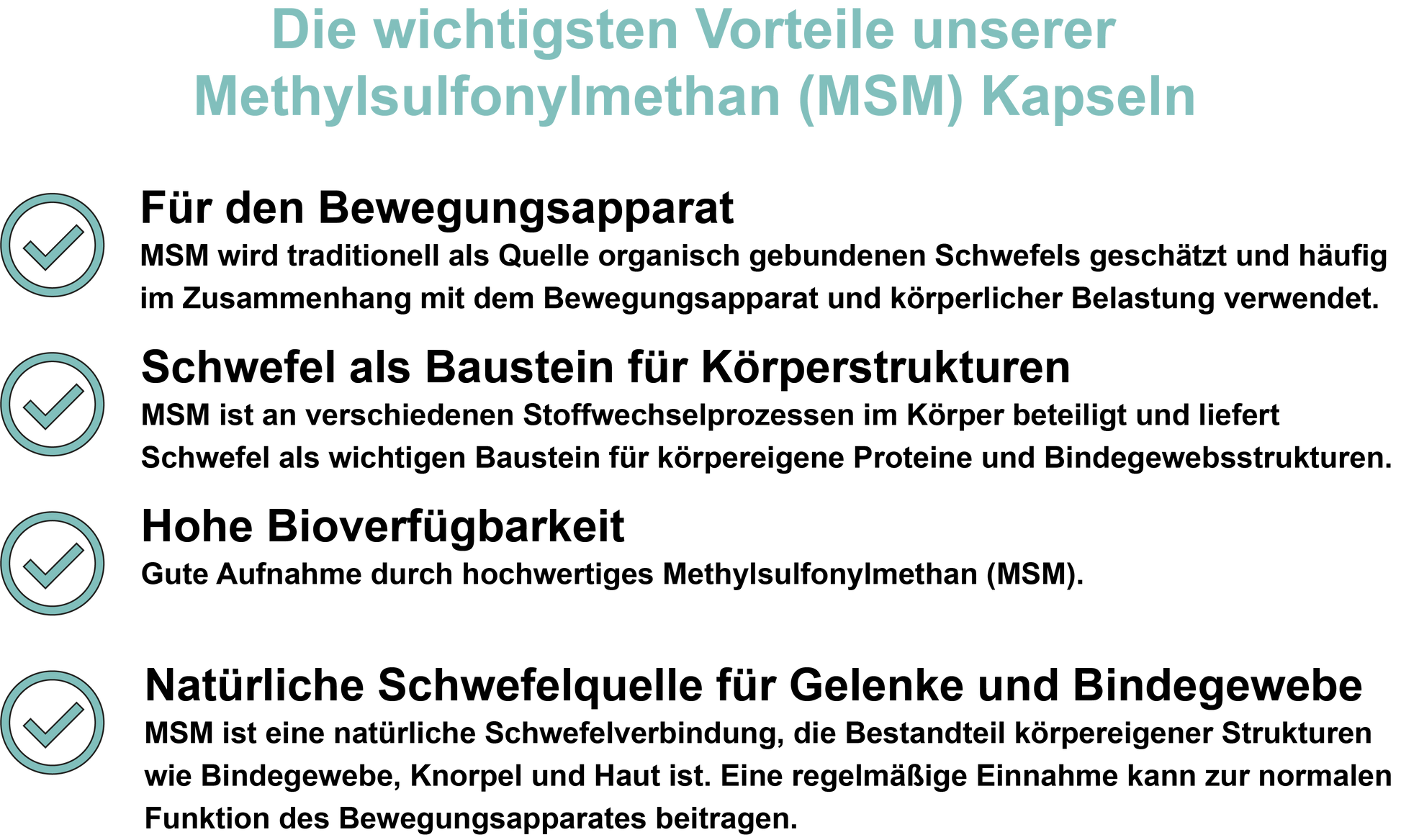 MSM liefert organisch gebundenen Schwefel, der als Bestandteil körpereigener Strukturen dient und den Körper mit diesem Element versorgt.