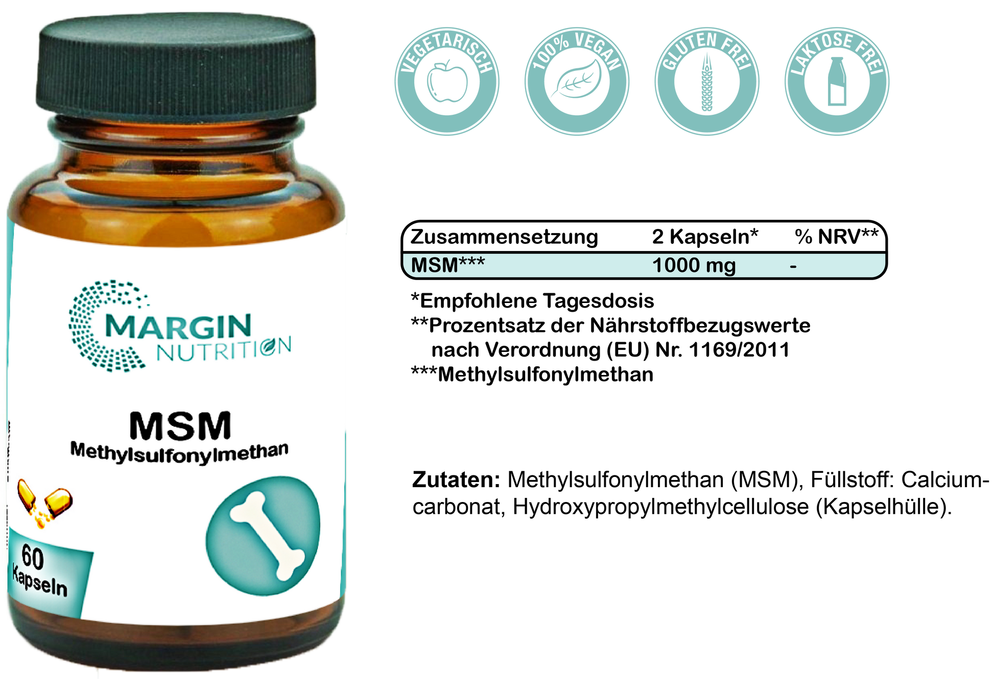 Methylsulfonylmethan (MSM), Füllstoff: Calciumcarbonat, Hydroxypropylmethylcellulose (Kapselhülle).Verzehrempfehlung: