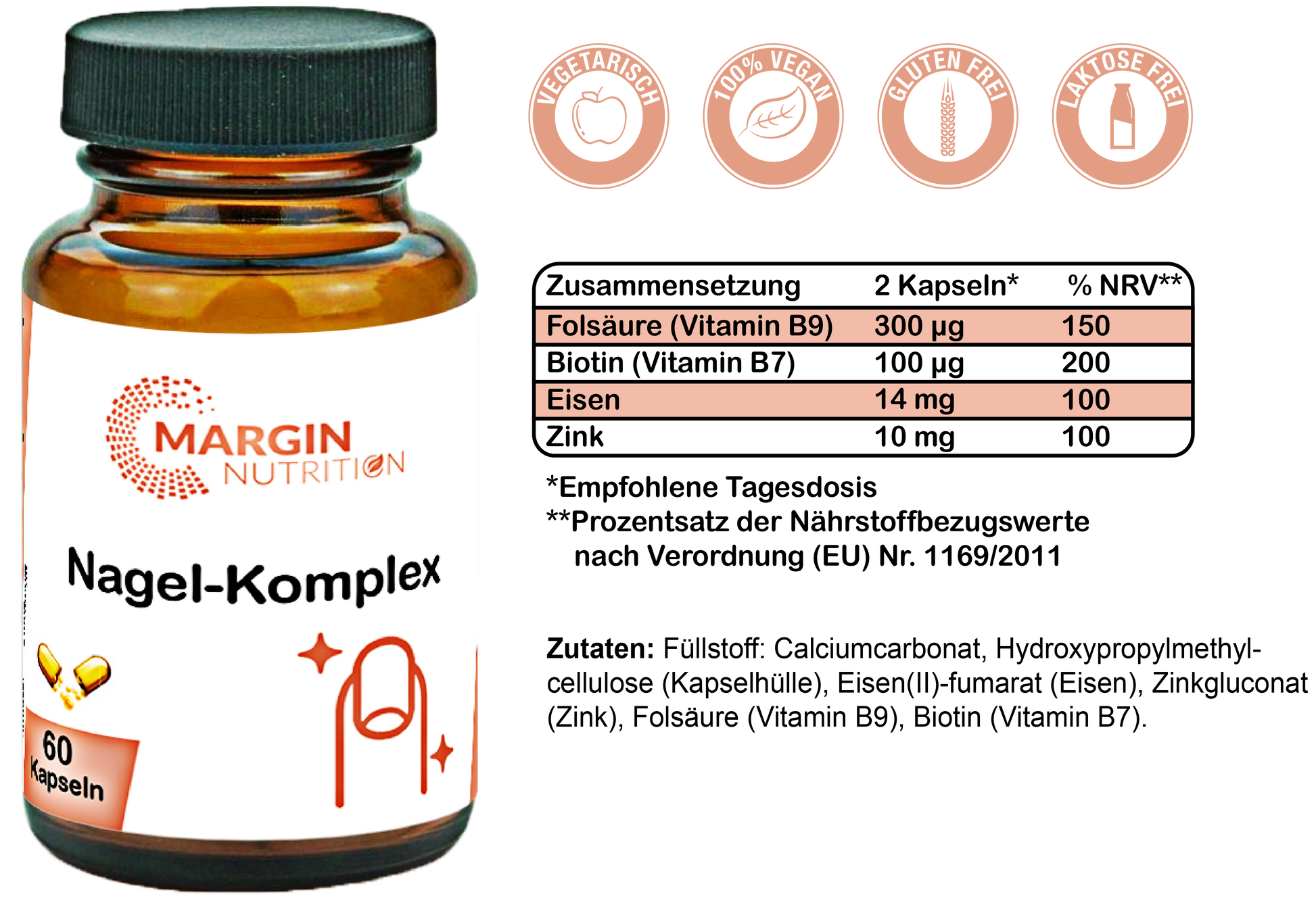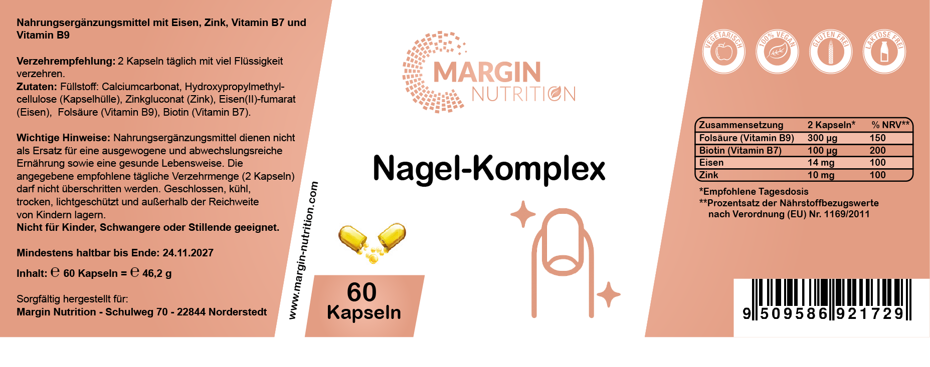 Nagel-Komplex / Mit Eisen, Zink, Vitamin B7 (Biotin) und Vitamin B9 (Folsäure) (30, 60, 2x60, 3x60 Vegane Kapseln)