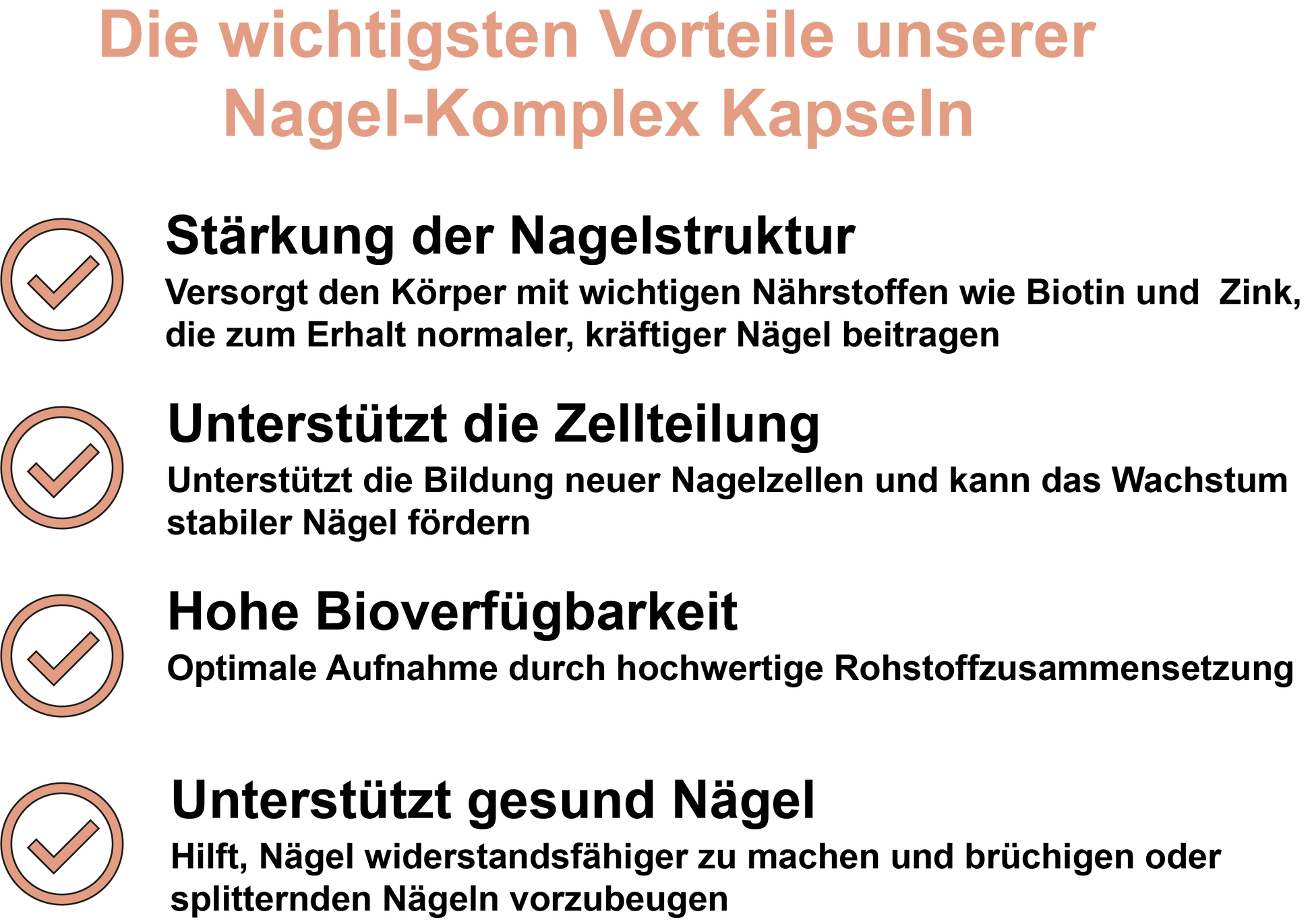Besonders Menschen mit unausgewogener Ernährung oder in belastenden Lebensphasen können von einer gezielten Einnahme unseres Nagel-Komplexes profitieren.