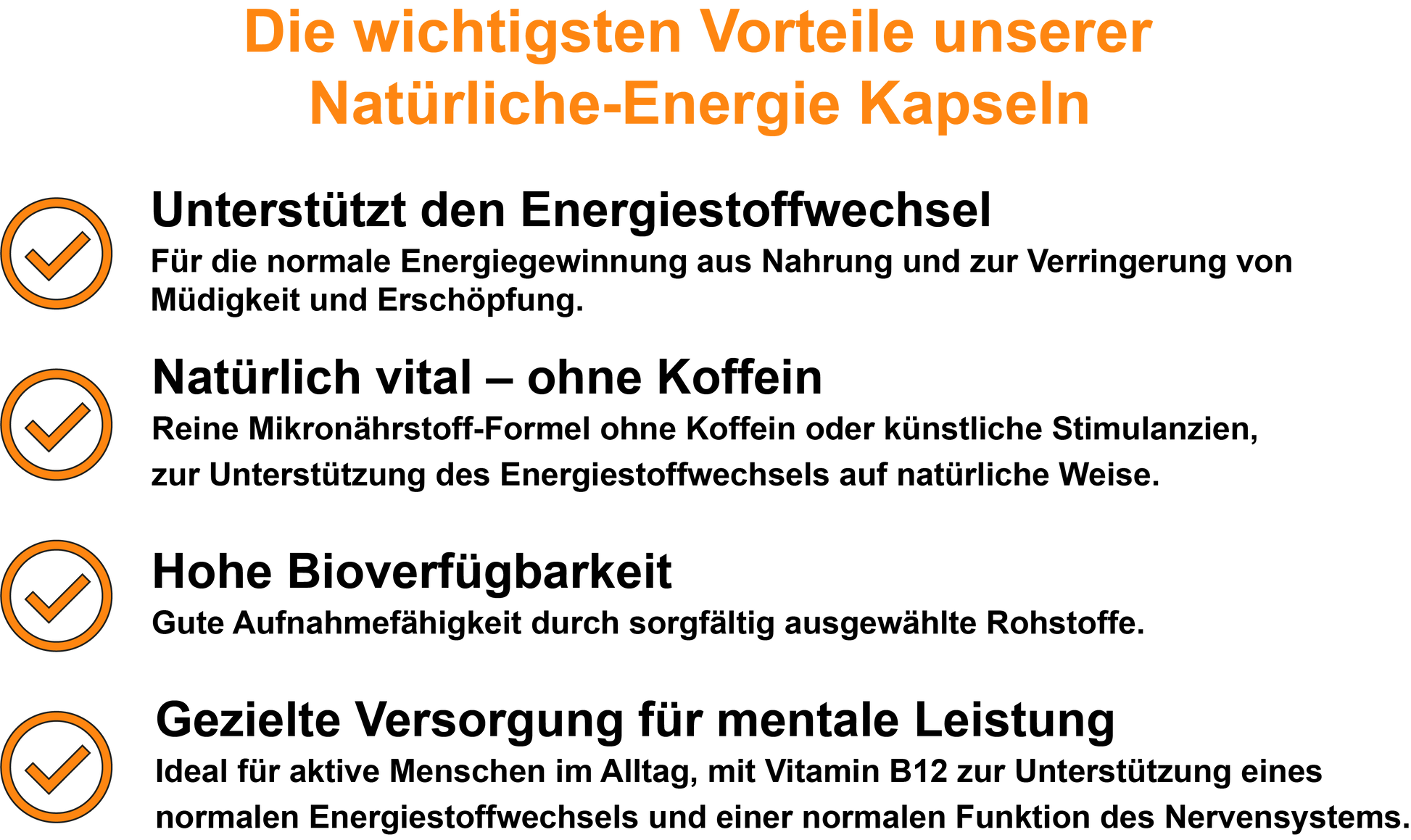 Unsere Natürliche-Energie Kapseln sind eine sinnvolle Ergänzung zur Unterstützung zentraler Stoffwechselfunktionen und eines normalen Energiestoffwechsels. Die enthaltenen Mikronährstoffe tragen zur Verringerung von Müdigkeit und Ermüdung bei und unterstützen die normale Funktion von Nerven- und Immunsystem.