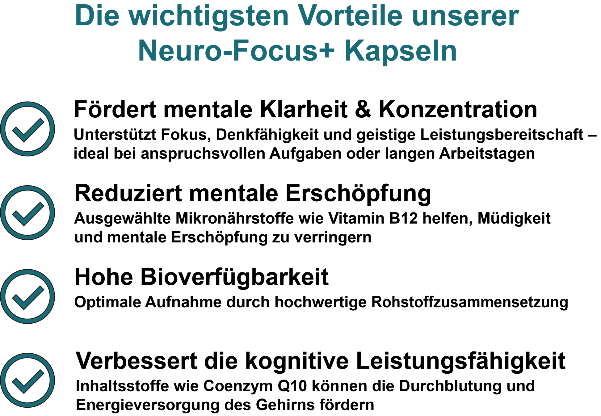 Unsere Neuro-Focus+ Kapseln wurden entwickelt, um die normale Funktion von Nervensystem und Psyche zu unterstützen – ideal in Phasen intensiver Konzentration, geistiger Belastung oder anspruchsvoller Arbeitstage. Die Kombination aus Koffein, Vitamin B12, Coenzym Q10 und Zink trägt zur Unterstützung von Konzentration, Energiestoffwechsel und normaler kognitiver Funktion bei. Koffein trägt zur Steigerung von Aufmerksamkeit und Wachheit bei – ideal für fokussiertes Arbeiten oder intensives Lernen. Vitamin B12 unterstützt den Energiestoffwechsel, trägt zur Verringerung von Müdigkeit bei und ist essenziell für die normale Funktion des Nervensystems. Coenzym Q10 ist eine vitaminähnliche Substanz, die natürlicherweise im Körper vorkommt und am zellulären Energiestoffwechsel beteiligt ist – besonders im Gehirn, wo ein hoher Energiebedarf besteht.