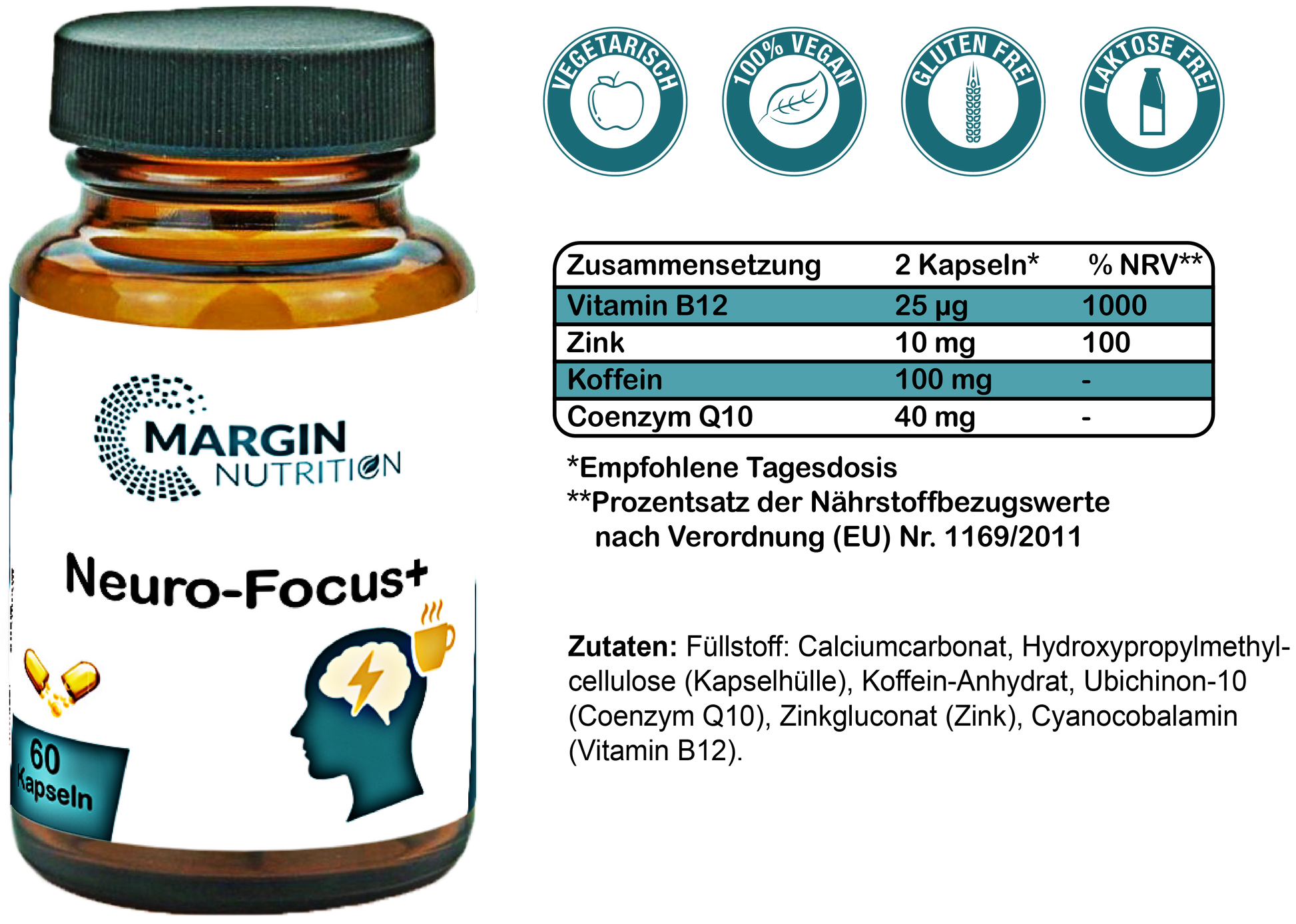 Neuro-Focus+ / Mit Koffein, Vitamin B12, Coenzym Q10 und Zink (30, 60, 2x60, 3x60 Vegane Kapseln)