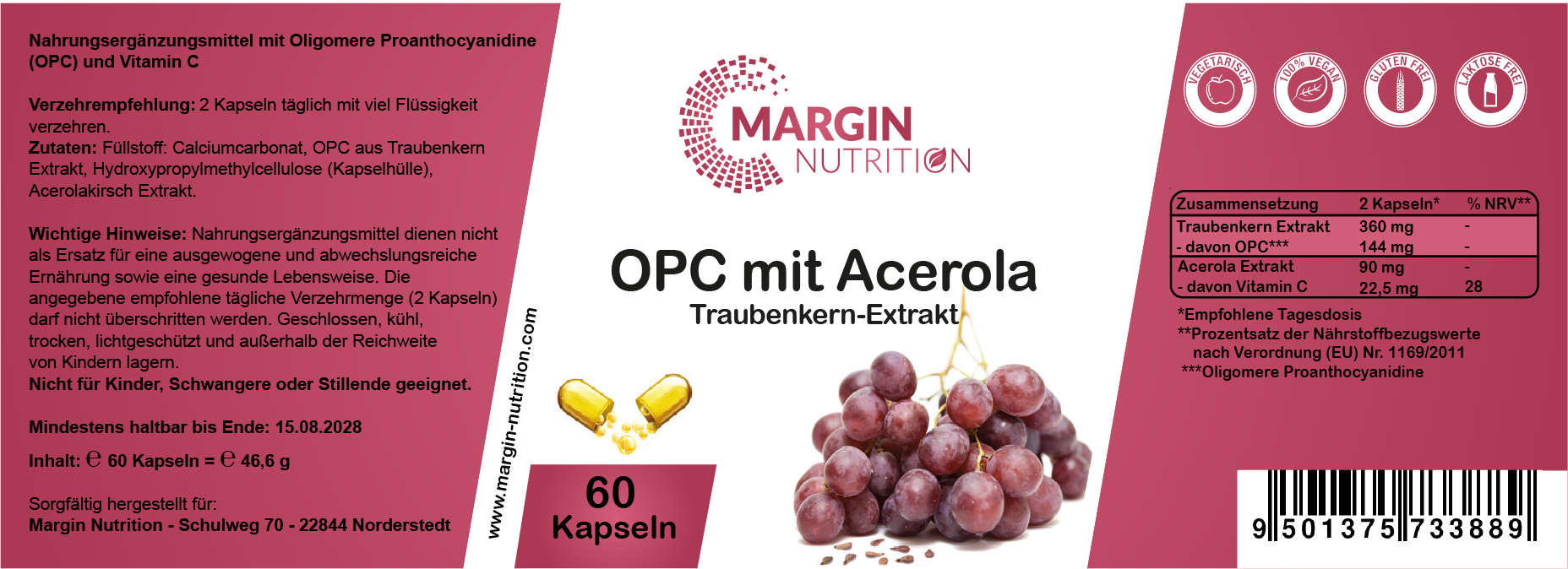 Füllstoff: Calciumcarbonat, OPC aus Traubenkern Extrakt, Hydroxypropylmethylcellulose (Kapselhülle), Acerolakirsch Extrakt.Verzehrempfehlung: