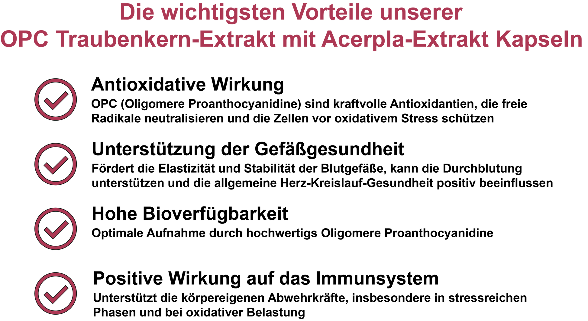 Bei der Entwicklung unseres OPC Präparats mit 360 mg Traubenkern-Extrakt und 90 mg Acerola-Extrakt pro Tagesdosis haben wir uns bewusst für eine ausgewogene Formulierung entschieden, die den Anforderungen moderner Lebensumstände entspricht. Die Dosierung orientiert sich an aktuellen ernährungswissenschaftlichen Erkenntnissen und wurde so gewählt, dass sie eine zuverlässige Versorgung unterstützt.