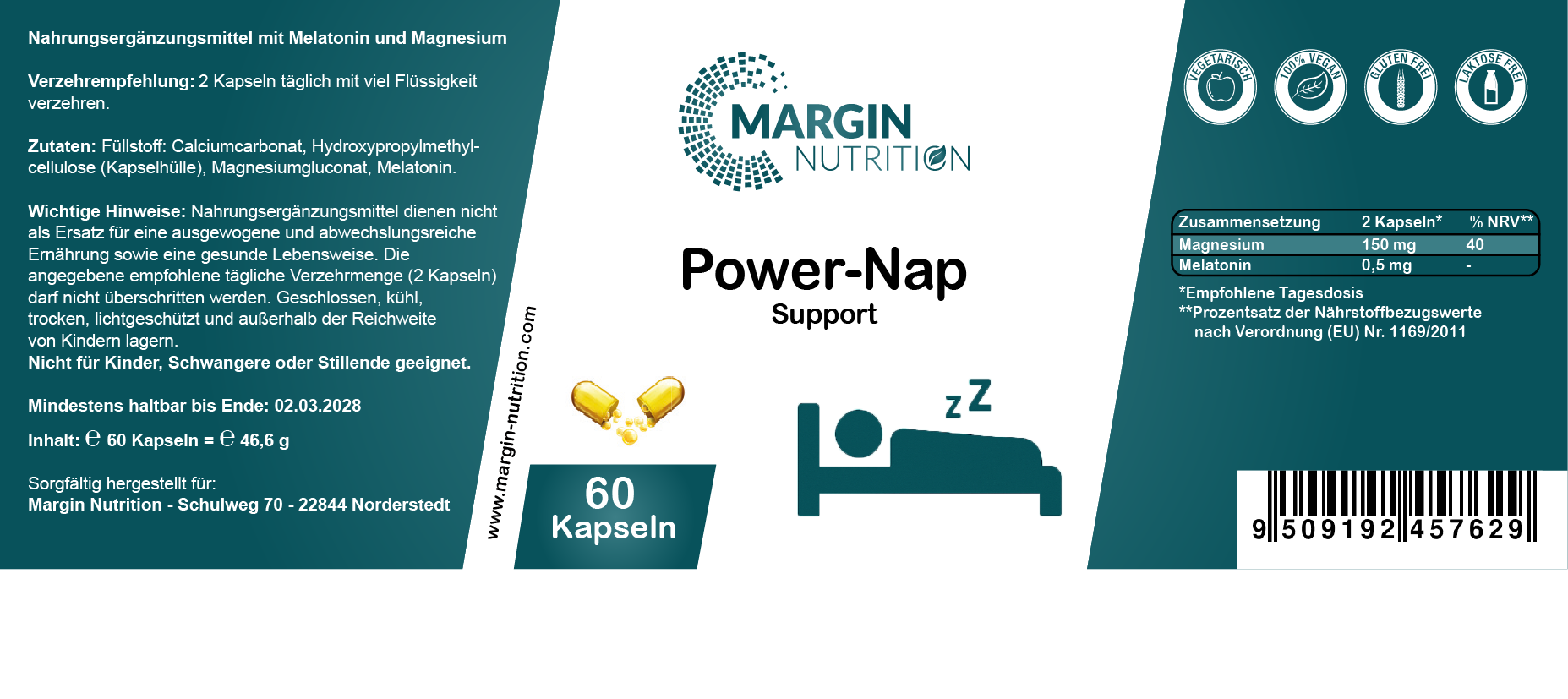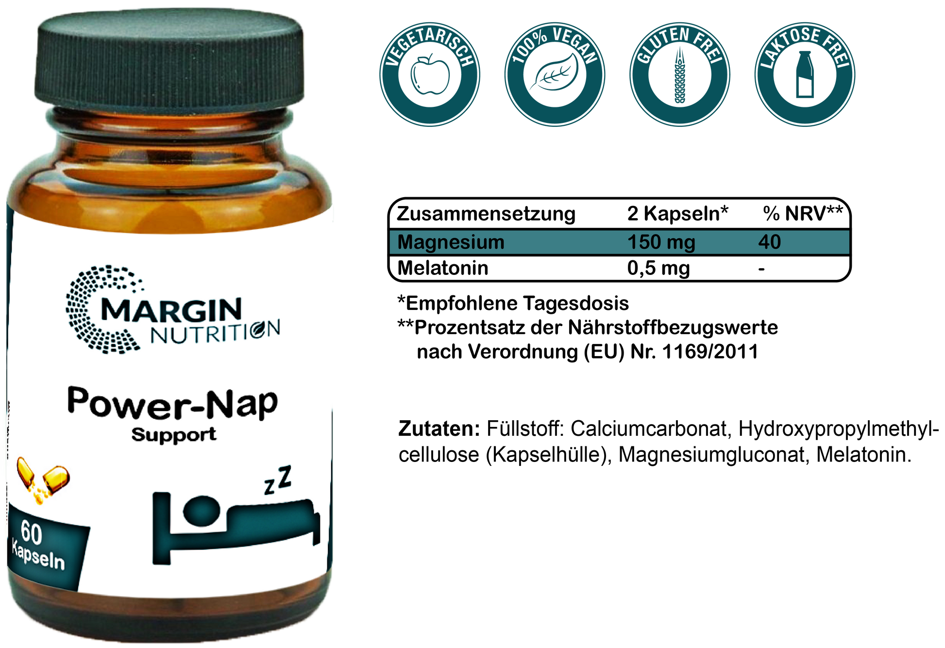 Füllstoff: Calciumcarbonat, Hydroxypropylmethylcellulose (Kapselhülle), Magnesiumgluconat, Melatonin.Verzehrempfehlung: