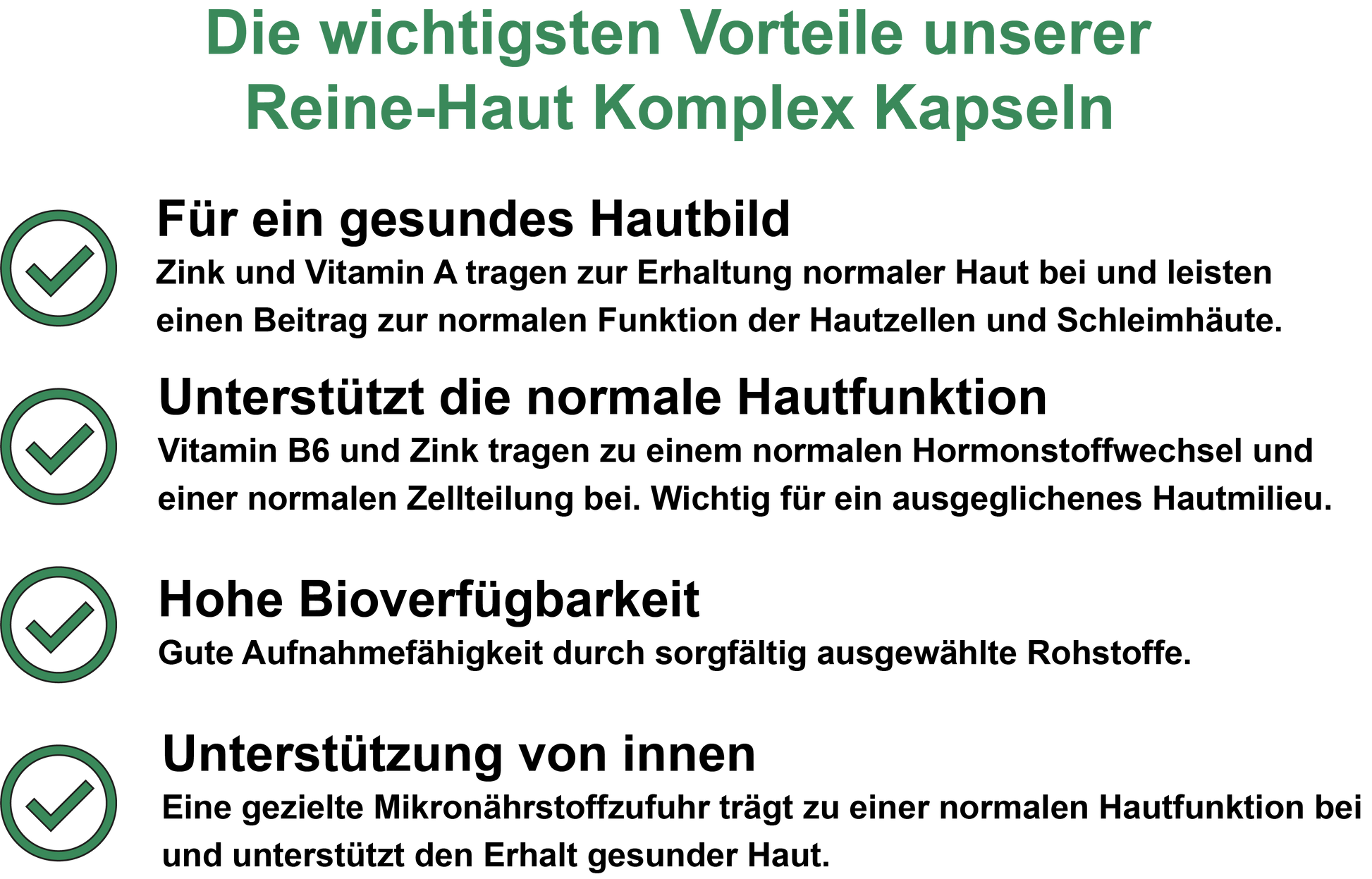 Unsere Reine-Haut Komplex Kapseln liefern dem Körper eine gezielte Unterstützung bei der Aufrechterhaltung zahlreicher zentraler Funktionen für die Haut. Die enthaltenen Mikronährstoffe spielen eine Rolle bei der Hauterneuerung, beim antioxidativen Zellschutz und bei Stoffwechselprozessen.