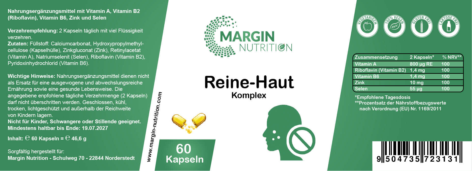 Reine-Haut Komplex – Mit Vitamin A, Vitamin B2 (Riboflavin), Vitamin B6, Zink und Selen | 30, 60, 2×60, 3×60 vegane Kapseln