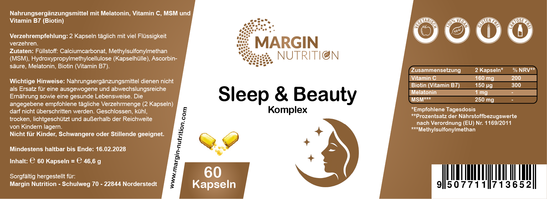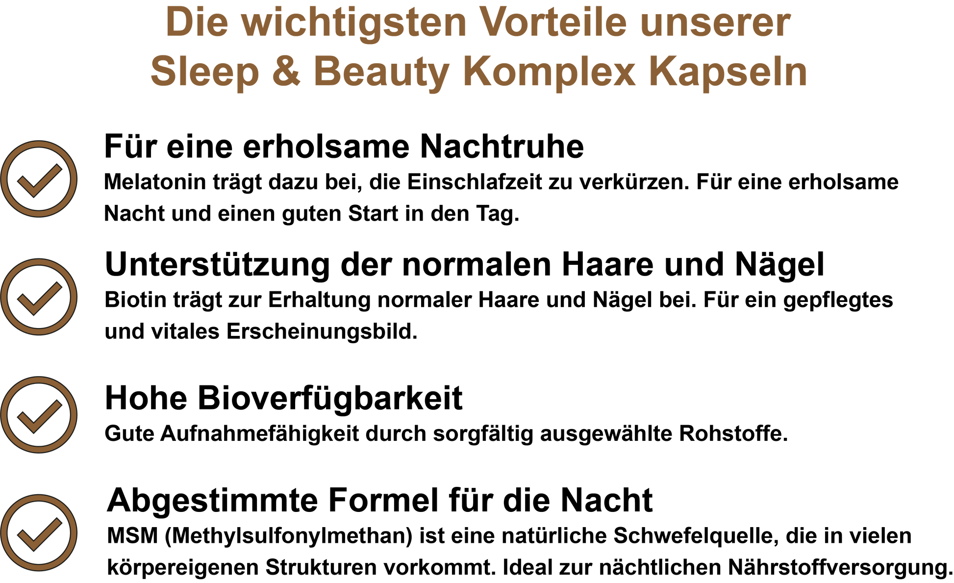 Sleep & Beauty Komplex – Mit Melatonin, Vitamin C, MSM und Vitamin B7 (Biotin) | 30, 60, 2×60, 3×60 vegane Kapseln