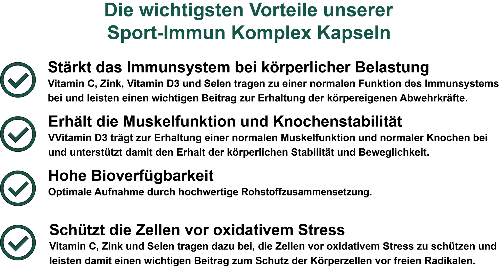 Bei der Entwicklung unseres Sport-Immun Komplexes mit 250 mg Magnesium, 300 mg Vitamin C, 10 mg Zink, 55 µg Selen und 25 µg Vitamin D3 pro Tagesdosis haben wir uns bewusst für eine ausgewogene Formulierung entschieden. Die Dosierung orientiert sich an aktuellen ernährungswissenschaftlichen Erkenntnissen und wurde so gewählt, dass sie einen Beitrag zur normalen Funktion des Immunsystems, zur Verringerung von Müdigkeit und Ermüdung sowie zum Schutz der Zellen vor oxidativem Stress leisten kann.