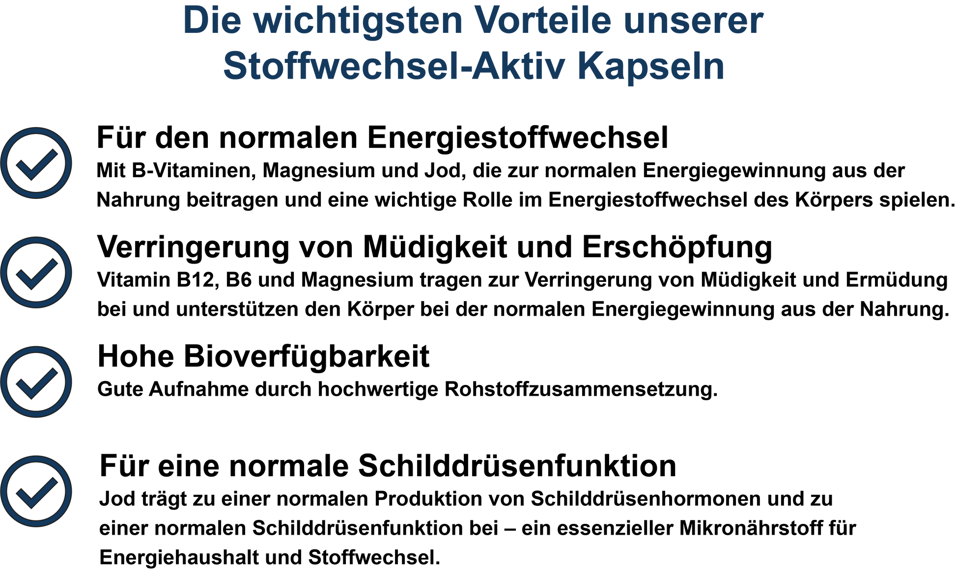 Unsere Stoffwechsel-Aktiv Kapseln liefern dem Körper eine gezielte Unterstützung bei der Aufrechterhaltung zentraler Funktionen des Energiestoffwechsels und der normalen Funktion von Nervensystem und Psyche. Die enthaltenen Mikronährstoffe tragen dazu bei, Energie aus der Nahrung bereitzustellen, den normalen Stoffwechsel von Schilddrüsenhormonen zu unterstützen und Müdigkeit sowie Erschöpfung zu verringern – besonders wichtig bei körperlicher oder mentaler Belastung.