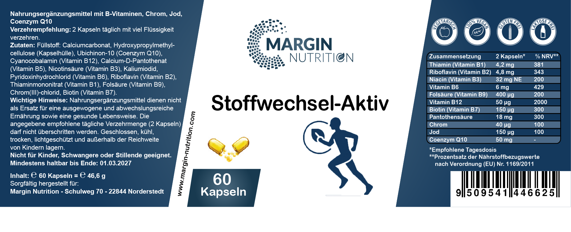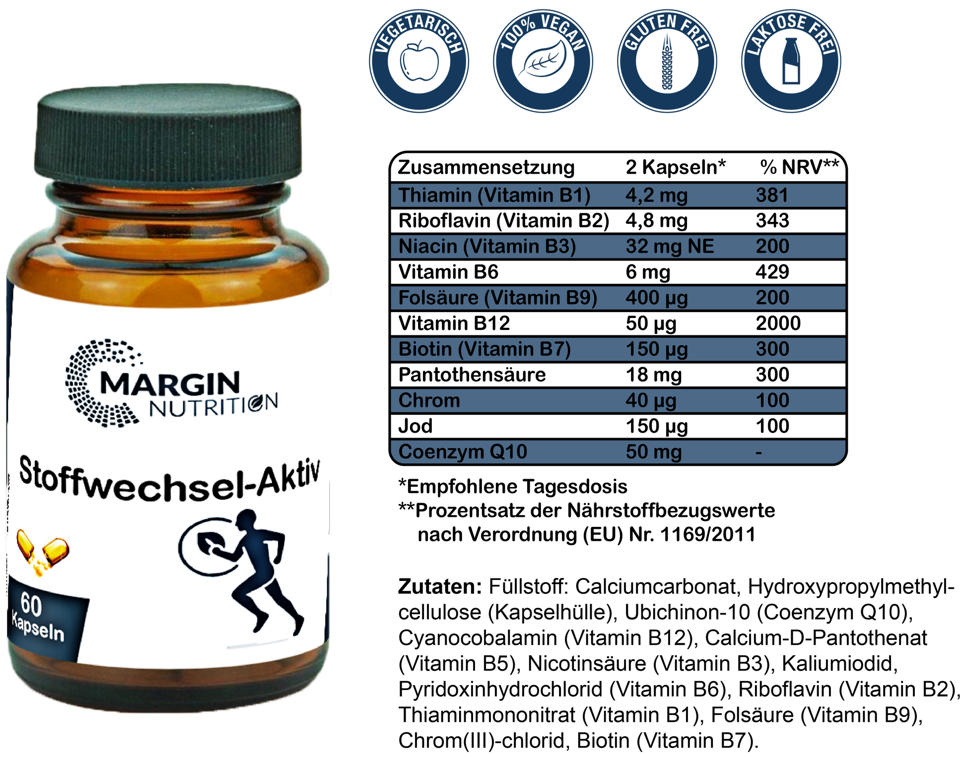 Stoffwechsel-Aktiv / Mit allen 8 B-Vitaminen, Chrom, Jod und Coenzym Q10 (30, 60, 2x60, 3x60 Vegane Kapseln)