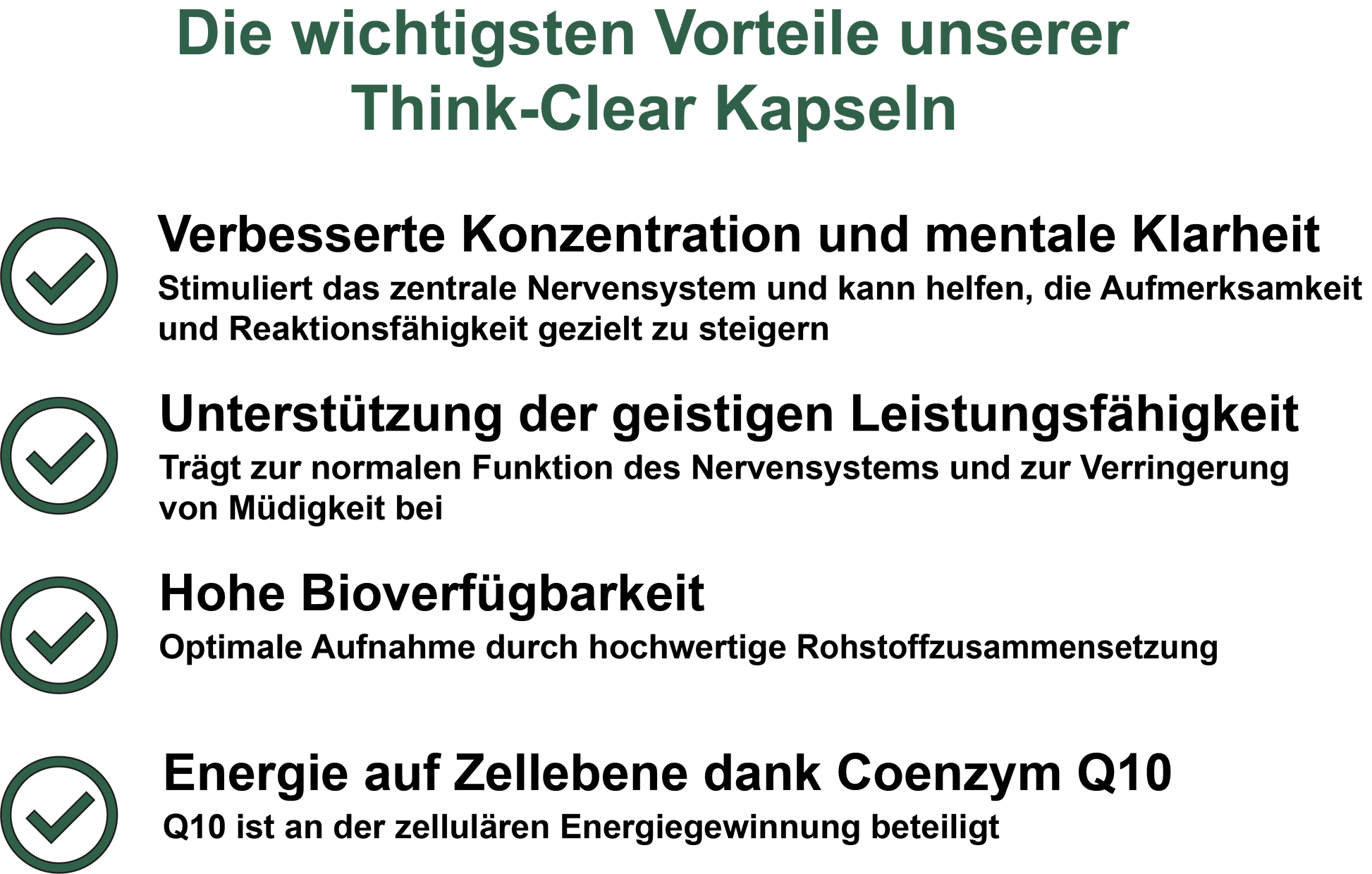 Unsere Think-Clear Kapseln vereinen vier gezielt ausgewählte Nährstoffe, die zur normalen psychischen Funktion, zur Unterstützung des Immunsystems und zum Schutz der Zellen vor oxidativem Stress beitragen. Die Kombination aus Vitamin D3, Folsäure, Selen und Coenzym Q10 wurde speziell dafür abgestimmt, Körper und Geist in anspruchsvollen Alltagssituationen zu unterstützen. Die Dosierung basiert auf aktuellen ernährungswissenschaftlichen Erkenntnissen und wurde so gewählt, dass sie eine sinnvolle Ergänzung zur täglichen Basisversorgung darstellt.