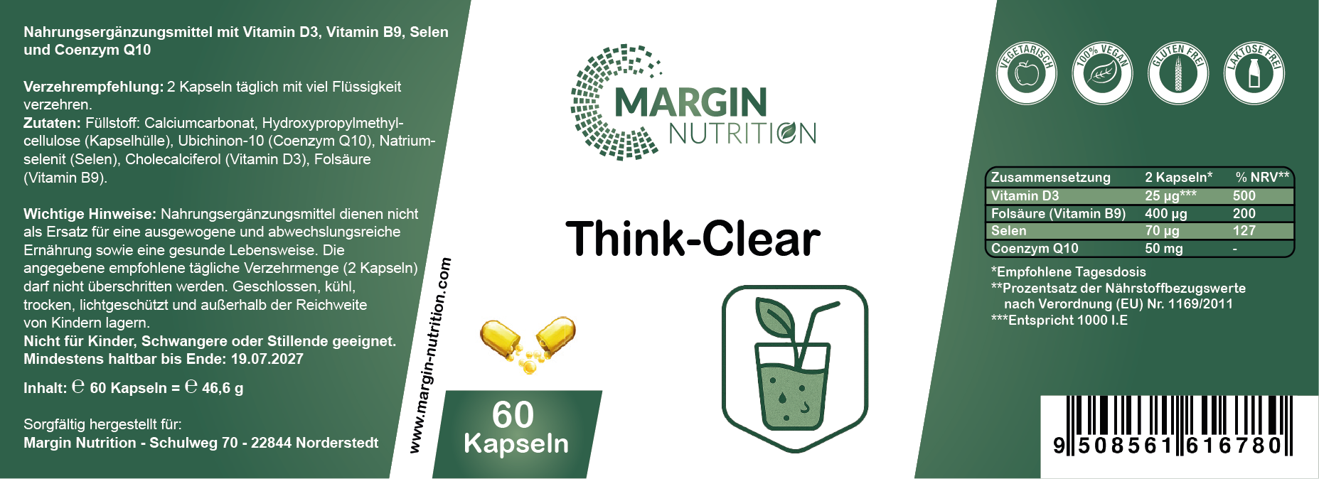 Think-Clear / Mit Vitamin D3, Vitamin B9 (Folsäure), Selen und Coenzym Q10 (30, 60, 2x60, 3x60 Vegane Kapseln)