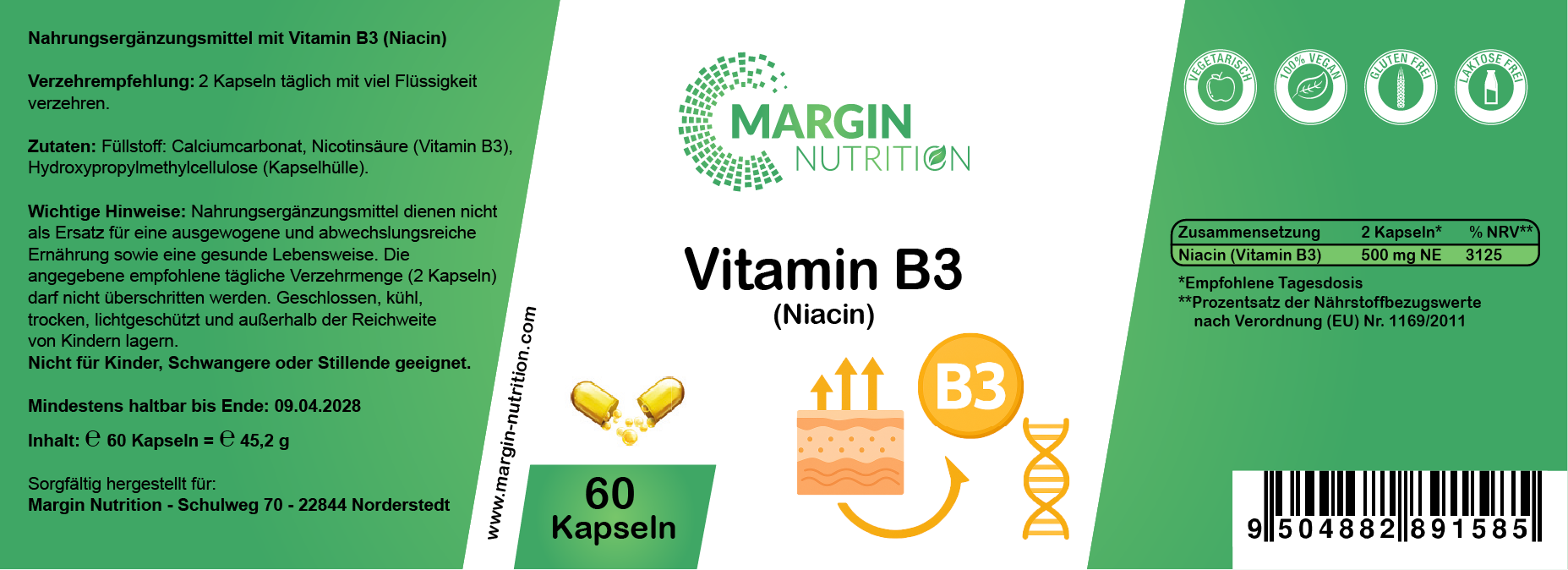 Vitamin B3 (Niacin) – Hochdosiert 500 mg NE pro Tagesdosis | 30, 60, 2×60, 3×60 vegane Kapseln