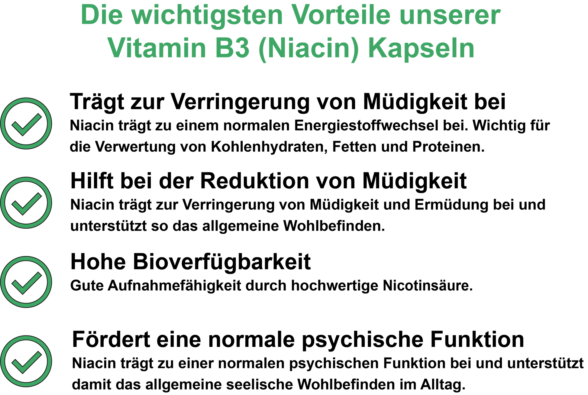 Unsere Vitamin B3 Kapseln mit Nicotinsäure tragen zu einem normalen Energiestoffwechsel, zur normalen Funktion des Nervensystems sowie zur Erhaltung normaler Haut und Schleimhäute bei. Darüber hinaus trägt Niacin zur Verringerung von Müdigkeit und Ermüdung bei.